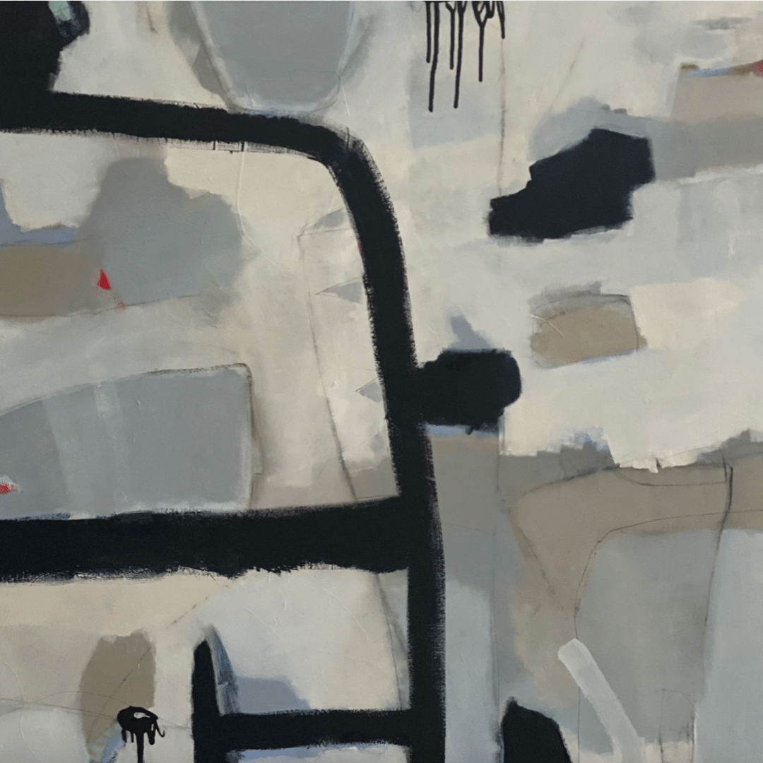 Blue Steel presents an abstract exploration of form and texture through a carefully balanced interplay of colour and line. The artwork features a muted palette of greys, beige and black, punctuated subtly by small touches of blue that draw the eye without overwhelming the composition. Thick, black lines sweep across the canvas in a loose grid pattern, curving and intersecting to create a sense of movement and structure at once. The background is composed of soft, layered patches of colour with diffuse edges that add depth and complexity. Black paint introduces an element of spontaneity, contrasting with the deliberate geometry and giving the piece an energetic, raw quality. This thoughtful combination of bold shapes and gentle textures invites viewers to reflect on themes of construction, resilience and balance.