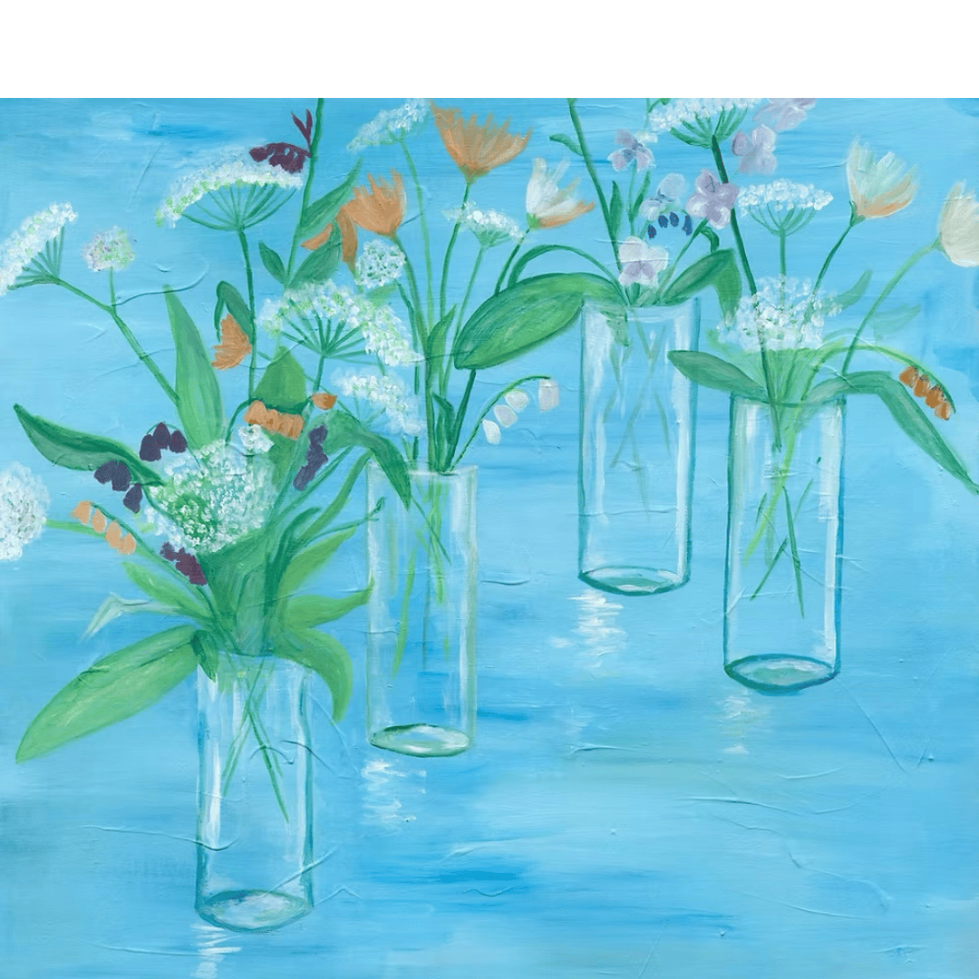 Four Glass Vases was painted when I was studying the colours created through an antique glass jar. I was also influenced by simple flower arrangements at a local show.