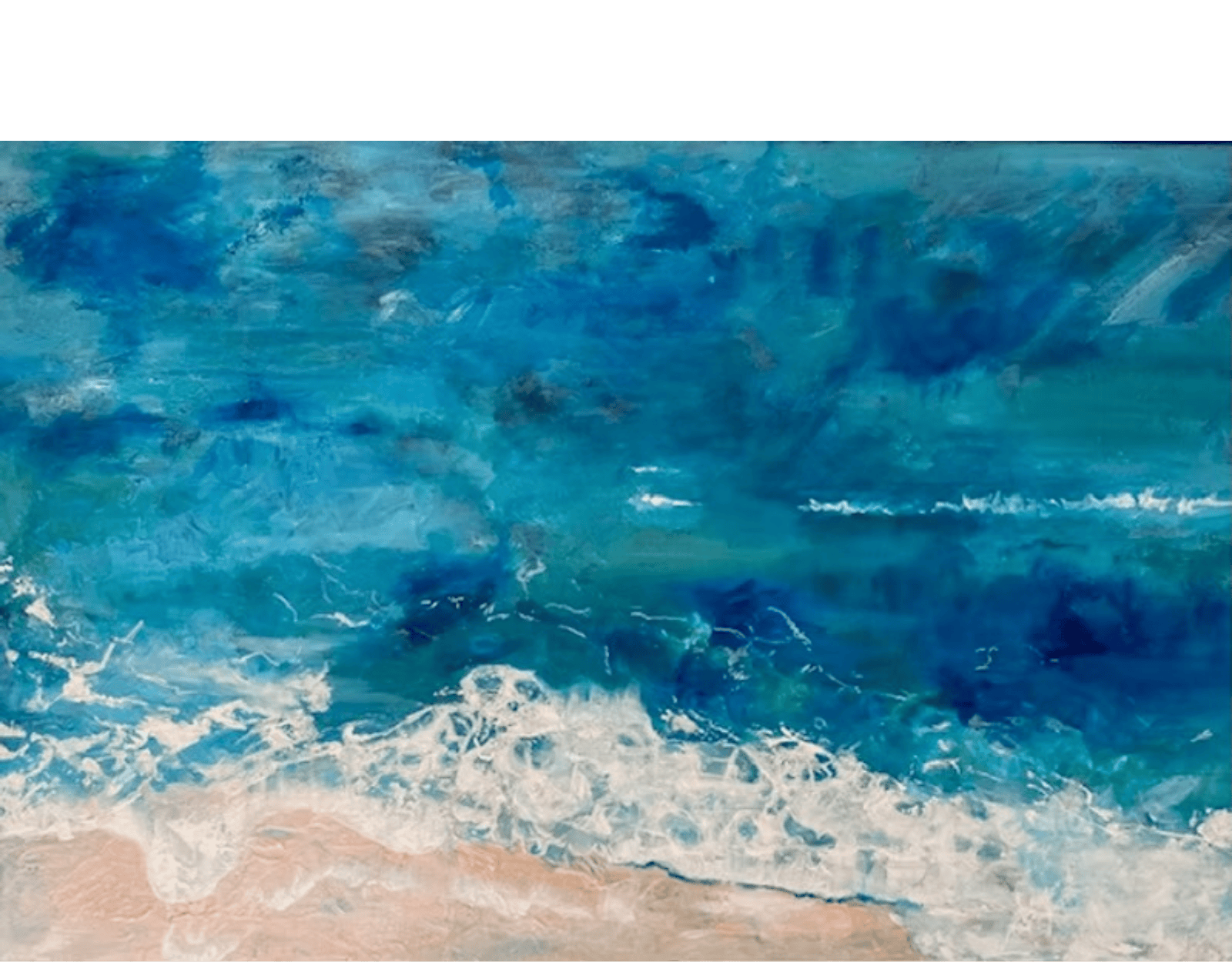 Beach Swirls is a vivid, abstract celebration of ocean energy and coastal tranquility. The painting captures the hypnotic motion of waves spiralling toward shore in sweeping, fluid strokes. Rich blues and seafoam greens swirl and collide with white crests, echoing the rhythm of crashing surf. The shoreline glows with warm sandy tones, offering a grounding contrast to the swirling sea.