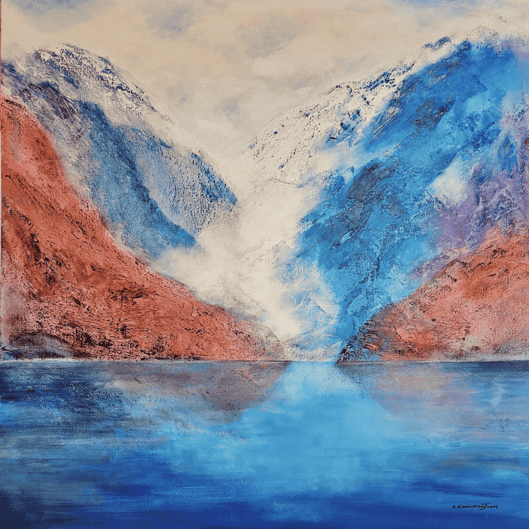 This highly textured, colourful painting was inspired by the way the clouds float down the valleys above the lake. It is an ever-changing scene and I used lots of texture, harmonious colours and many layers of soft colours for the reflections. It is a very striking piece which would make a lovely statement on any wall.