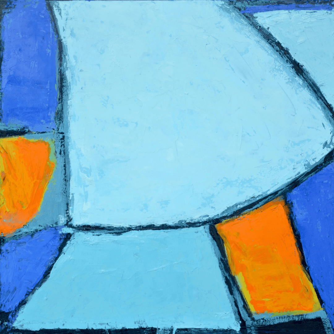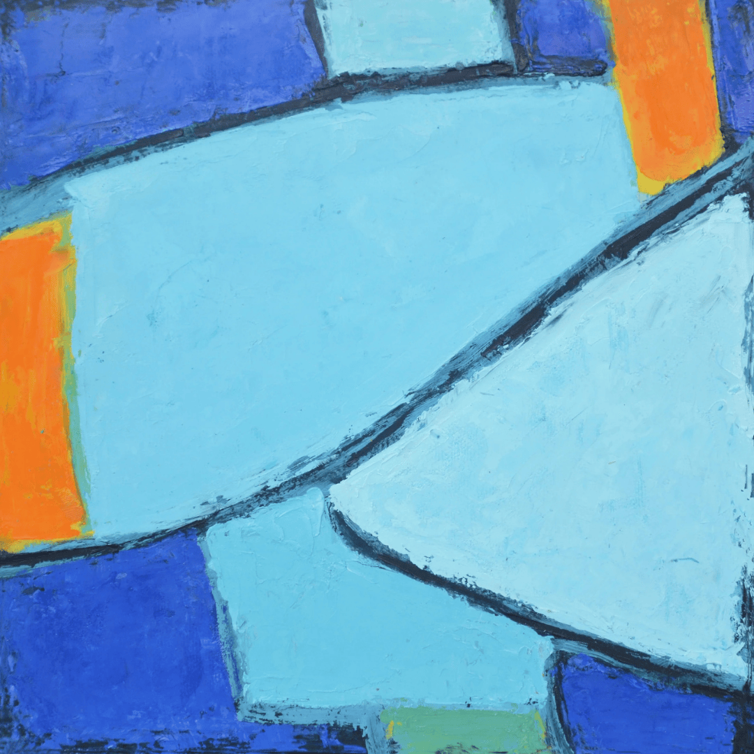 The composition is made of abstract shapes, mark making with pencils and fine lines created with a palette knife. Broad brush strokes and oil sticks create a textural surface, suggesting movement. The mid-blue, indigo and teal tones dominate the composition, contrasted with orange and white.