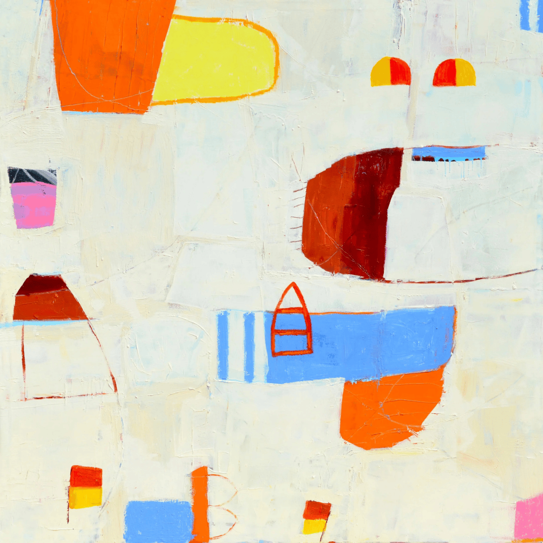 Towels, Boards, Tubes & Hot Sand is an expressive oil painting that captures the relaxed energy of a lazy summer morning at the beach in any Australian coastal city. I’ve employed a warm, “beachy” palette of sun-drenched yellows, creamy whites, soft blues and sandy pinks, evoking the light and colours of a perfectly relaxing summer day.