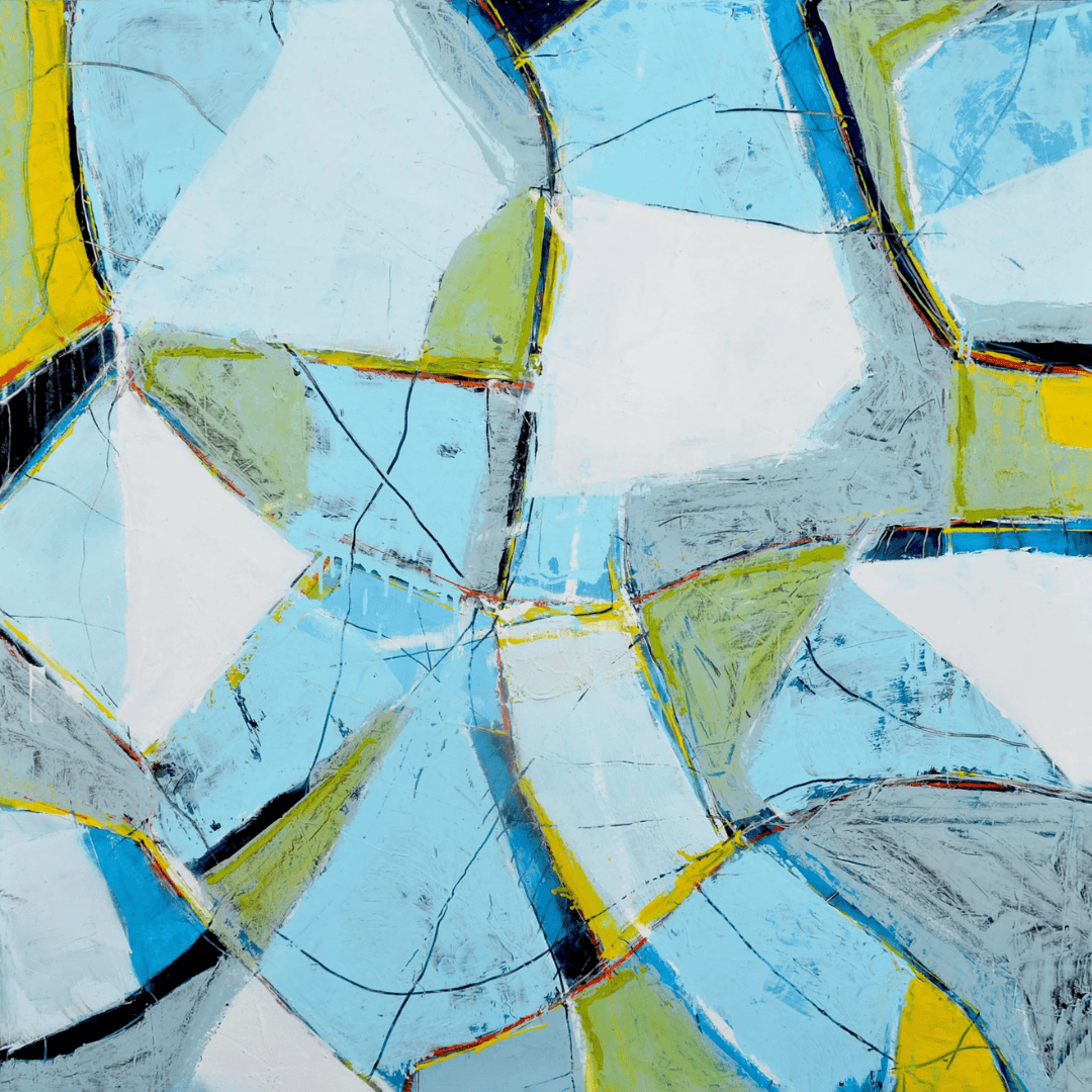 Breaking Dawn Over the Reef is an abstract artwork that captures the essence of a tranquil dawn rising over a partly exposed reef, with beach sand, rock pools and verdant seaweed. A unique blend of whites, blues, and lime yellow-green hues evoke the sense of movement of the early morning tide as it surges through the cracks in the reef.