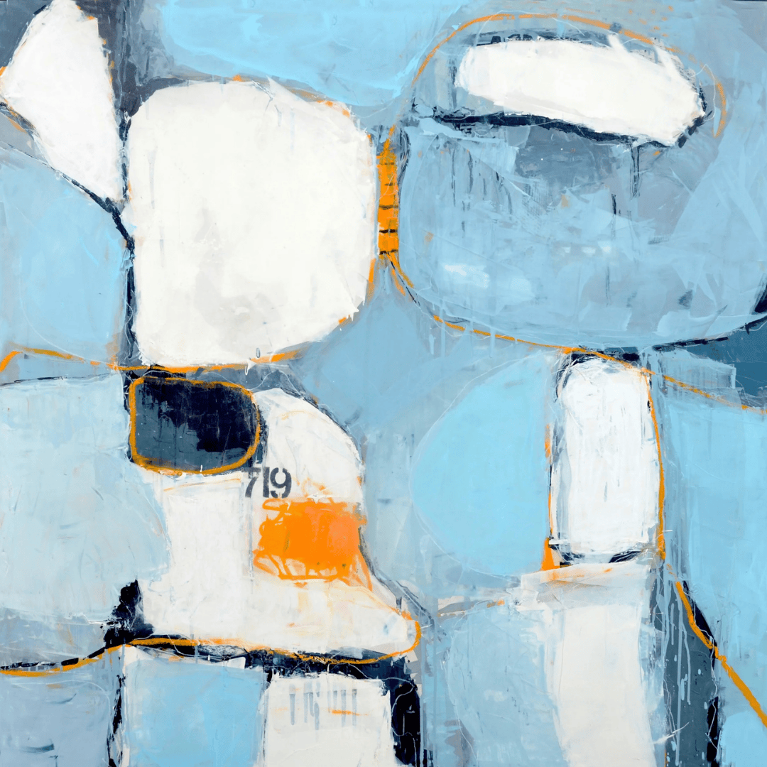 I invite viewers to transcend above the earth's surface and witness the raw beauty of salt lakes and ponds from an aerial vantage point. With a palette dominated by shades of grey, grey-blues, indigo, orange and white. The composition is a subtle harmony of colour and emotion, reflecting a profound connection with nature's designs, with the interruption of man’s presence symbolised with the inclusion of 719. The layered use of colour, texture and perspective offers an immersive experience, allowing viewers to lose themselves in a tranquil landscape.