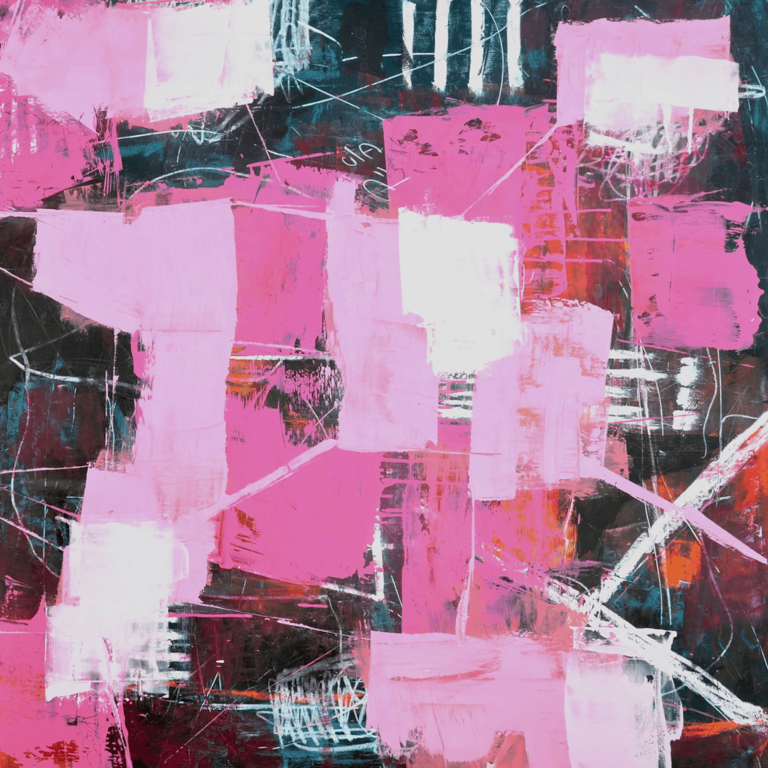 The pink geometric shapes in the foreground provide a contrast to the idea of infinite space with far distant nebula. The chaotic white lines add movement and energy to the composition. In the foreground, the pale to hot pink geometric shapes add an element of order to the otherwise disordered composition.