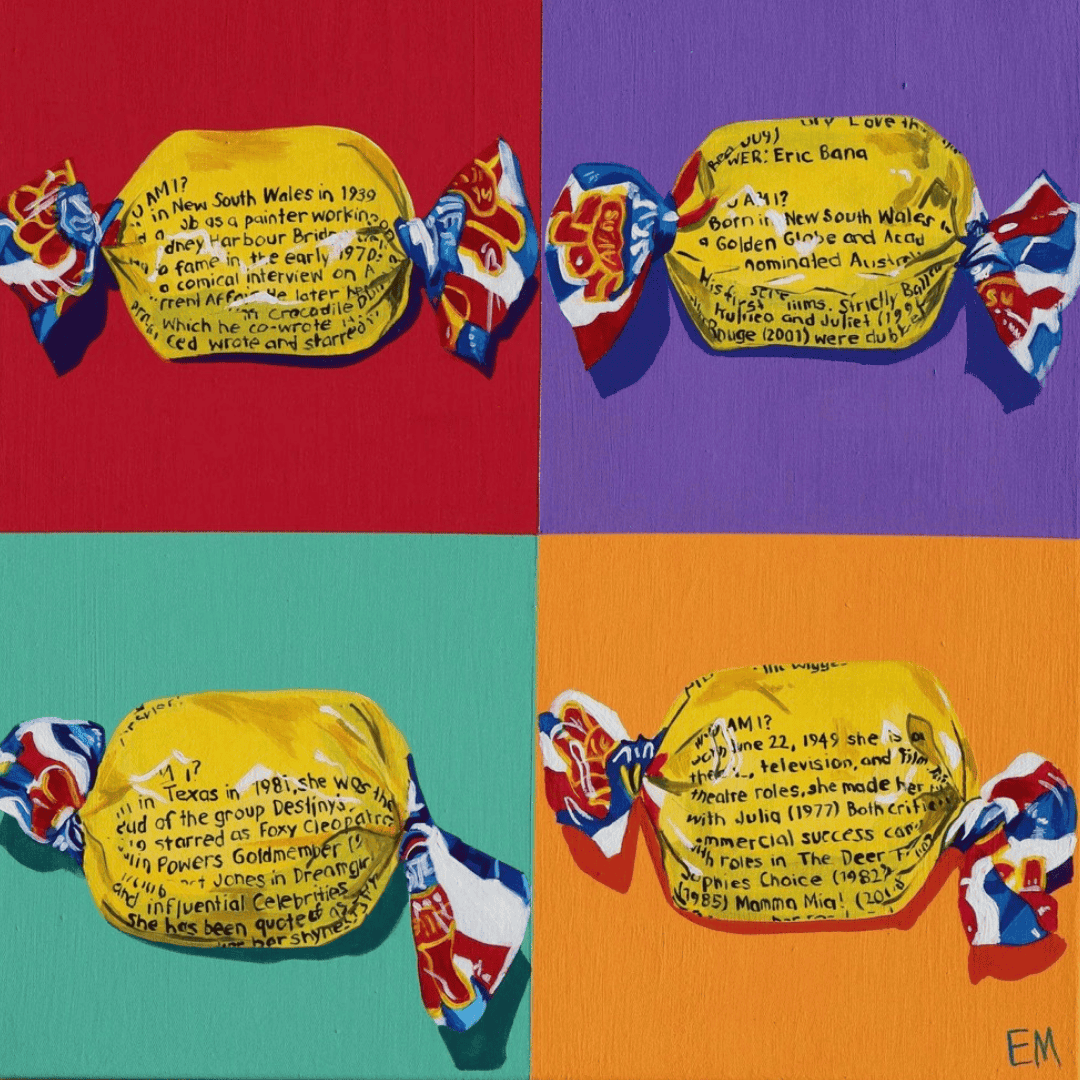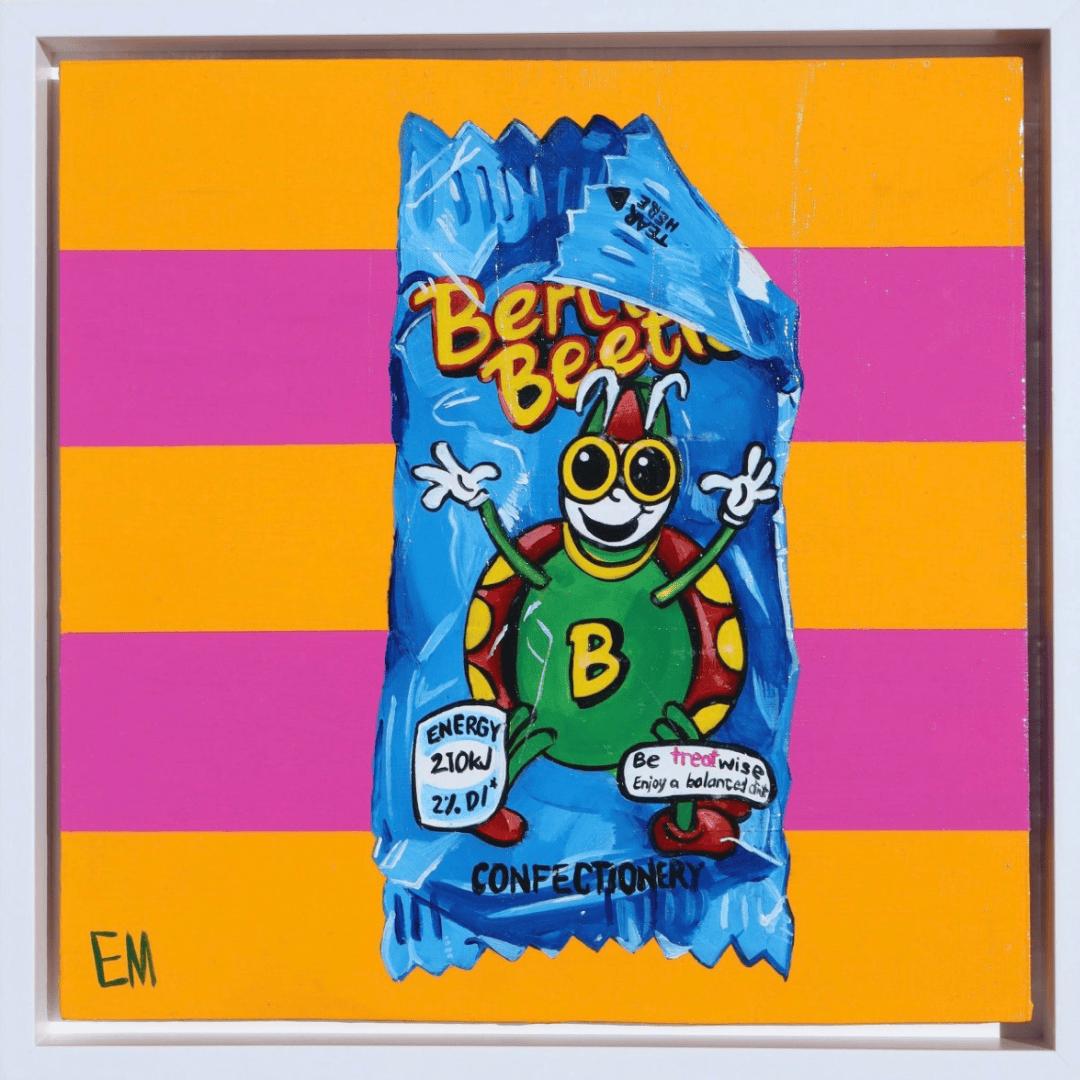 As I child I would stop by the local corner store to select lollies from the counter. I would always make sure to pay 20c for a handful of strawberry clouds. This whimsical painting is a nod to my own childhood, a playful piece that will make a statement on any wall.