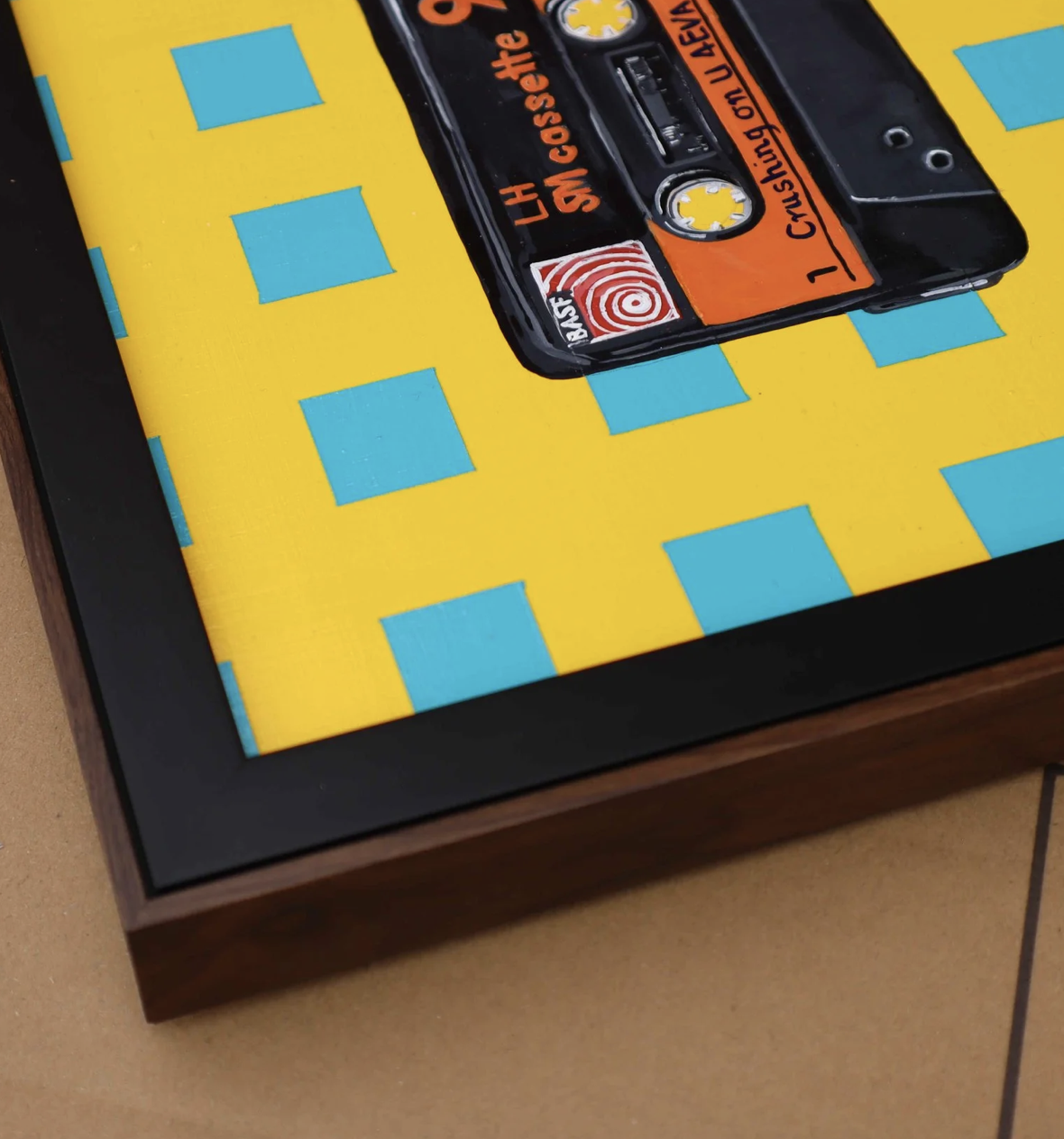 The retro bright yellow and blue background are a playful contrast to the cassette.