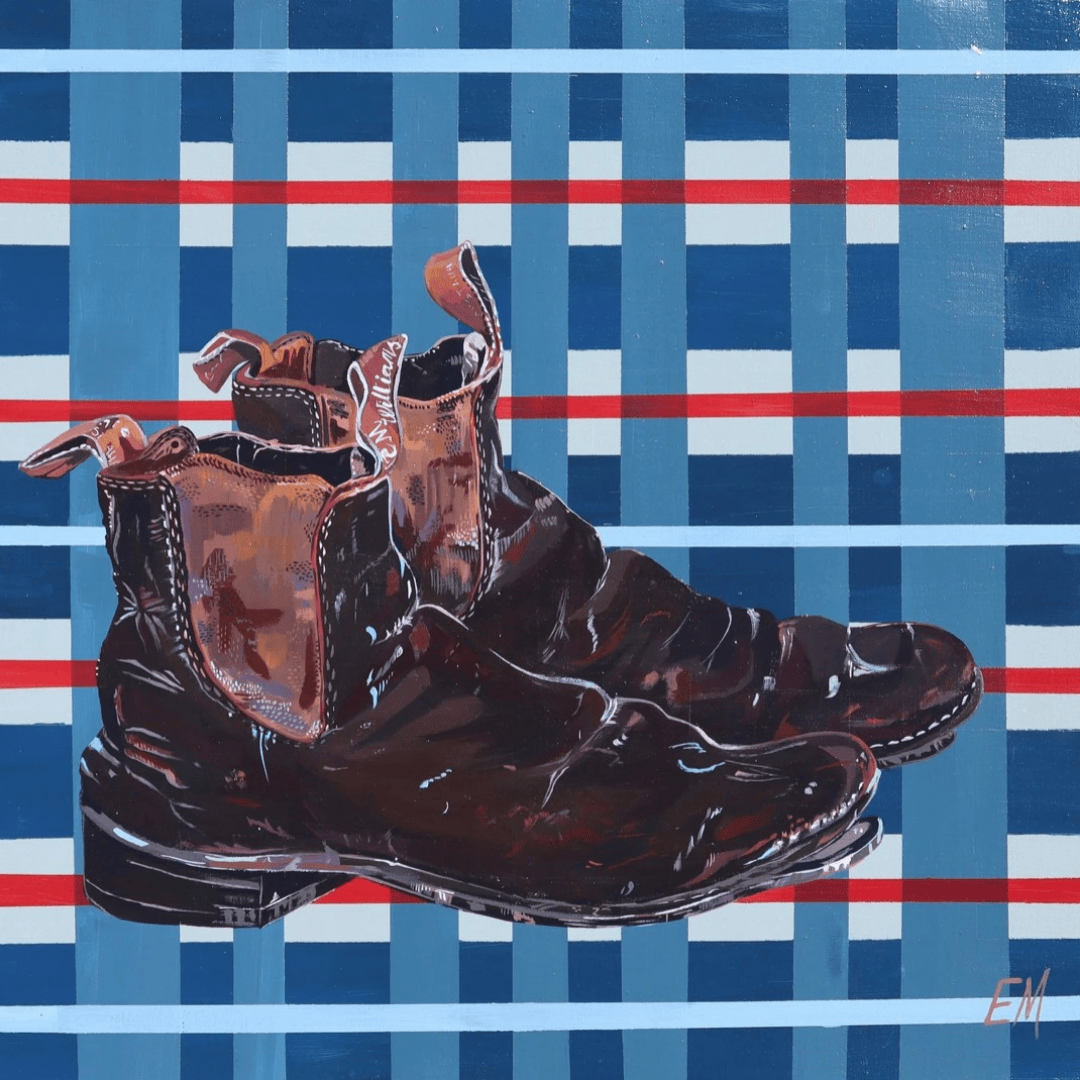 Oh The Stories They Could Tell is a vibrant acrylic painting that captures the iconic RM Williams boots.