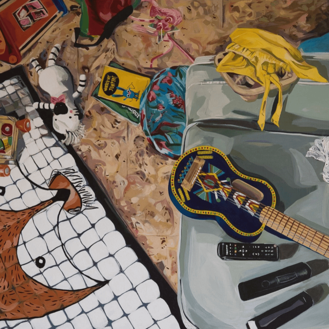 This painting tells an honest and relatable story of modern life, life as a parent.