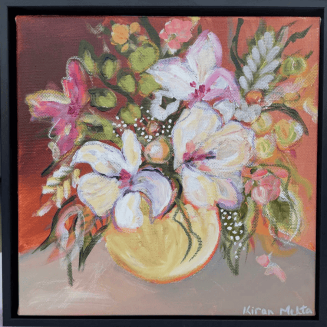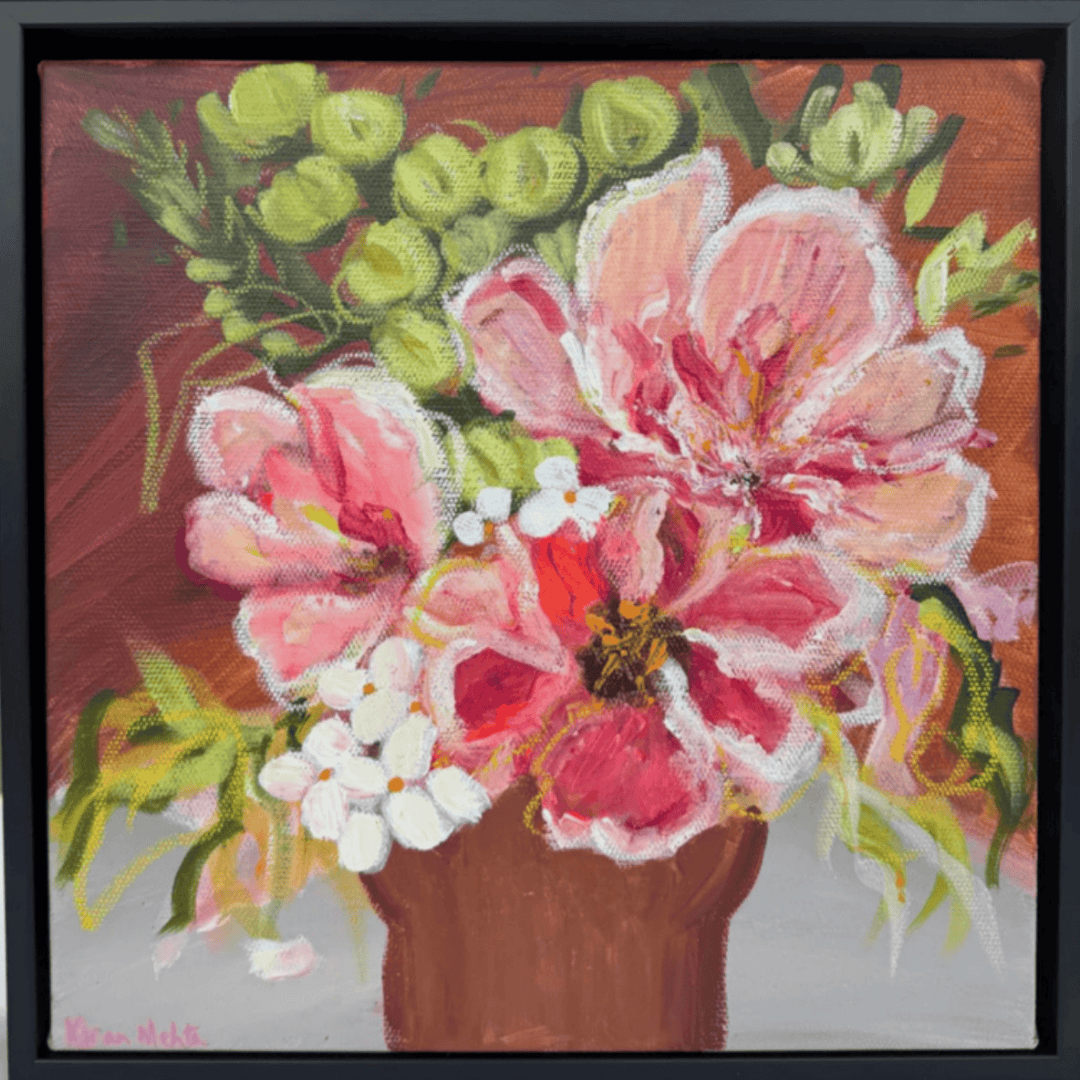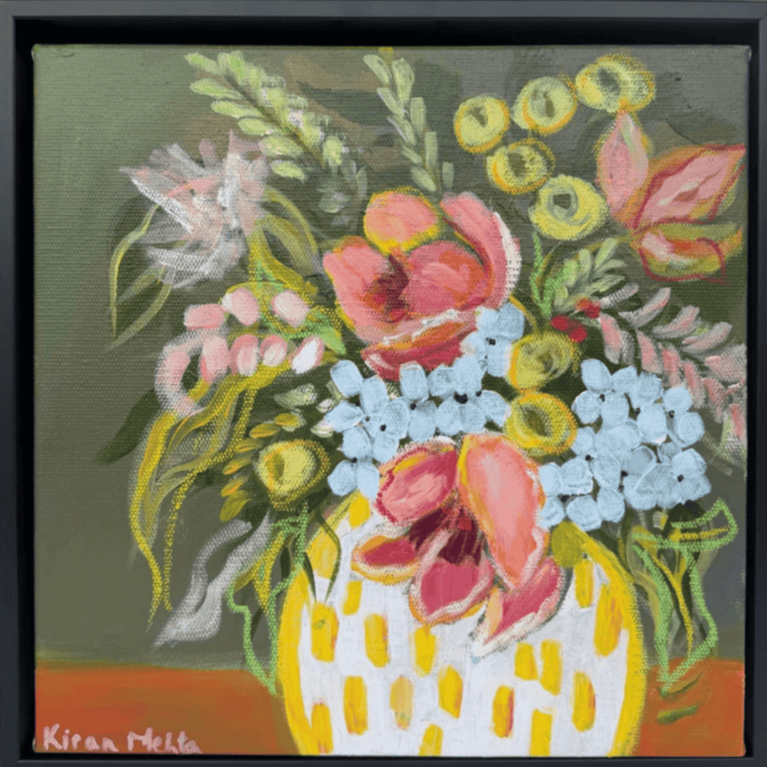 This artwork bursts with joyful colour — bright pinks, warm yellows, soft whites and fresh greens all coming together in a lively bouquet. The flowers feel bold and full of personality, painted with expressive strokes that make them stand out with confidence.