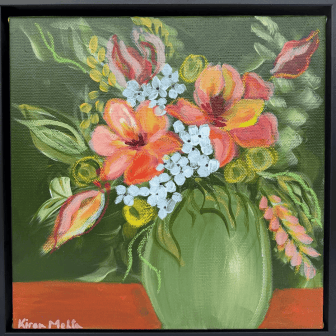 This floral painting bursts with bold pinks, warm oranges and fresh greens, gathered confidently in a striking green vase. The colours feel lively and fearless, with loose, expressive brushstrokes that give the bouquet a strong, vibrant presence.