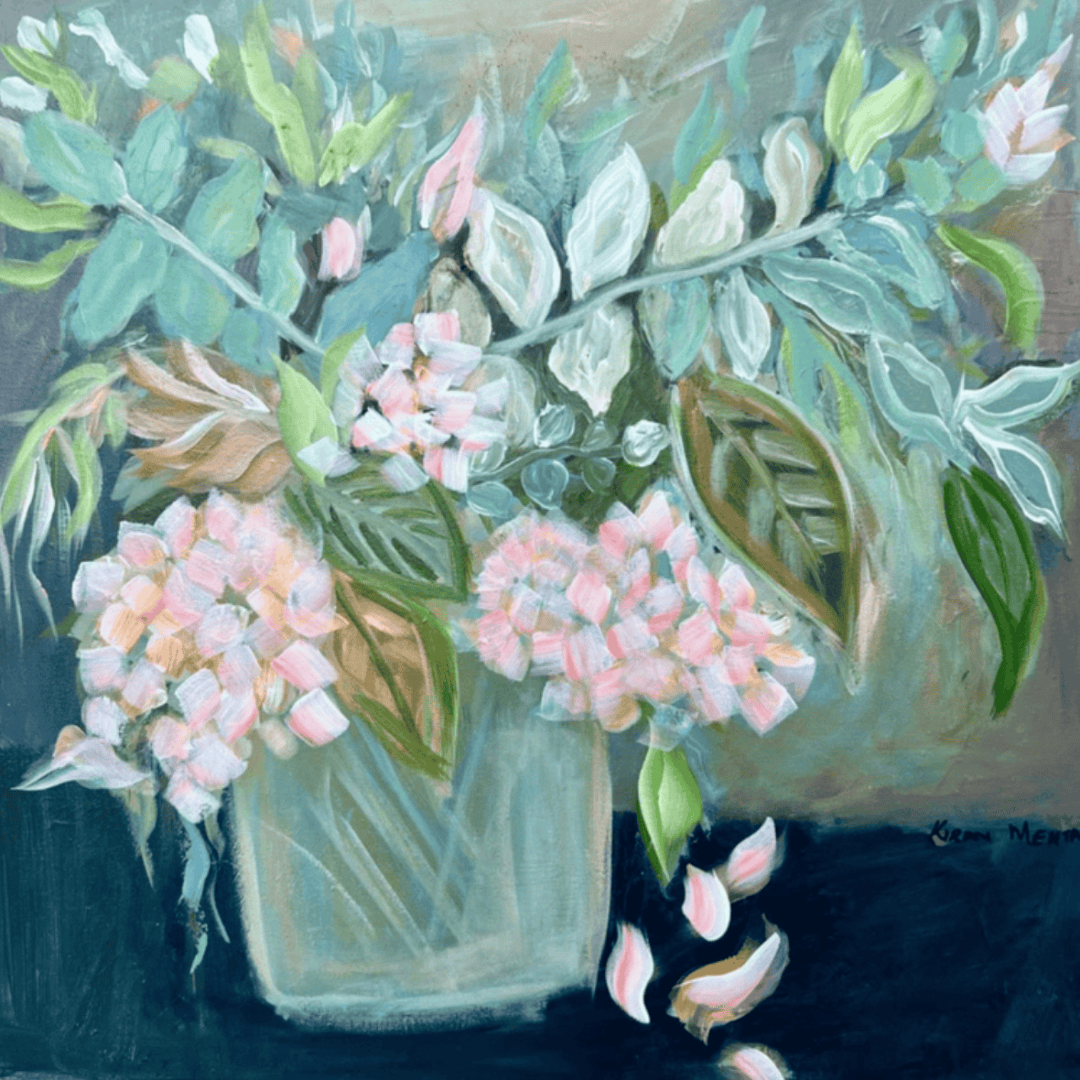 This painting shows a bright, peaceful bouquet bursting with soft pinks, warm corals and gentle greens. The flowers feel fresh and open, painted with loose, flowing strokes that give the whole piece a calm and easy energy.