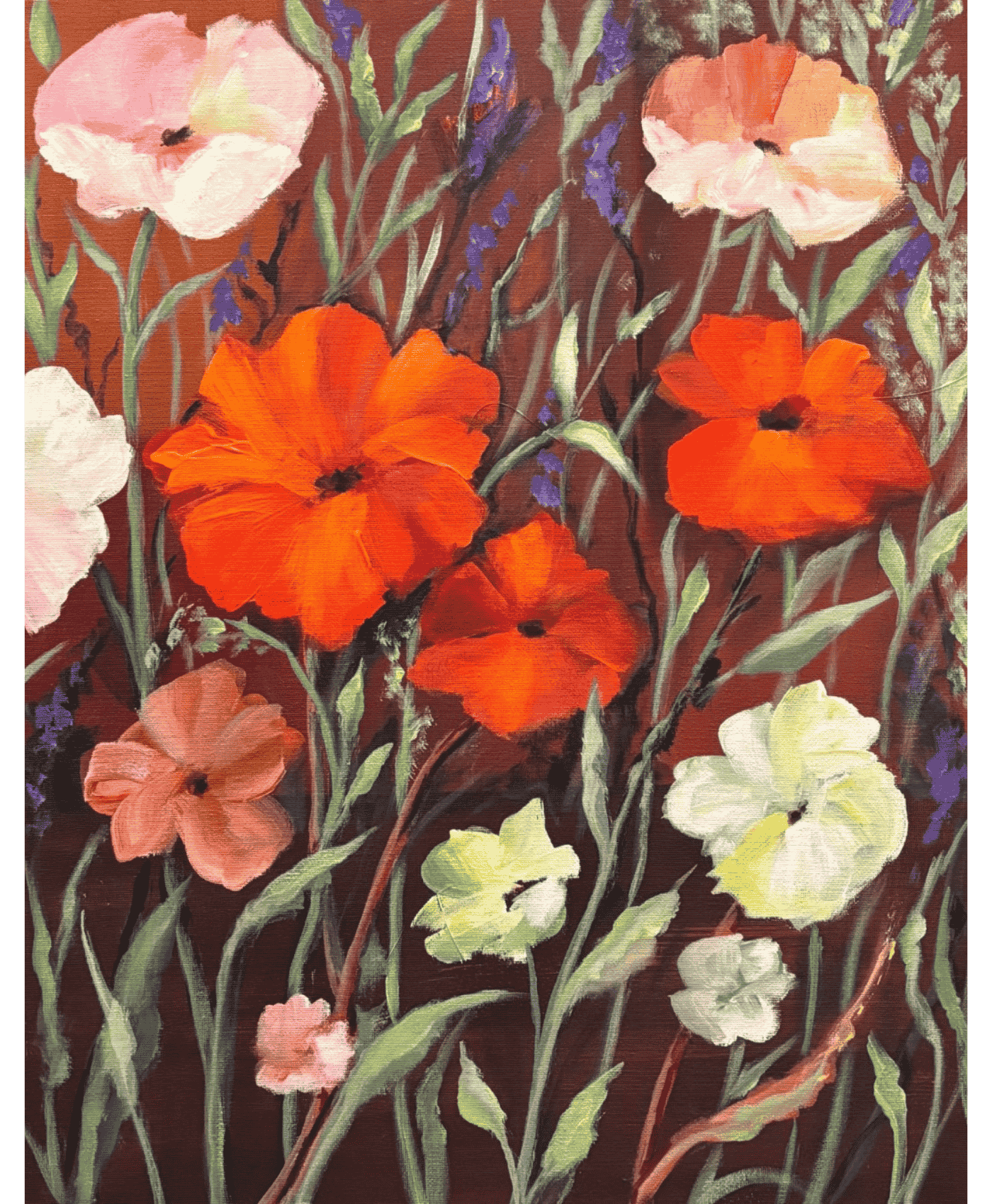 The inspiration for this pair of paintings was a section of the garden with the dark fence framing the variety of beautiful flowers. The colours and shapes are semi abstract and have a relaxed feel. The painting is small but packs a punch of colour. It can be paired with the second painting to form a diptych.