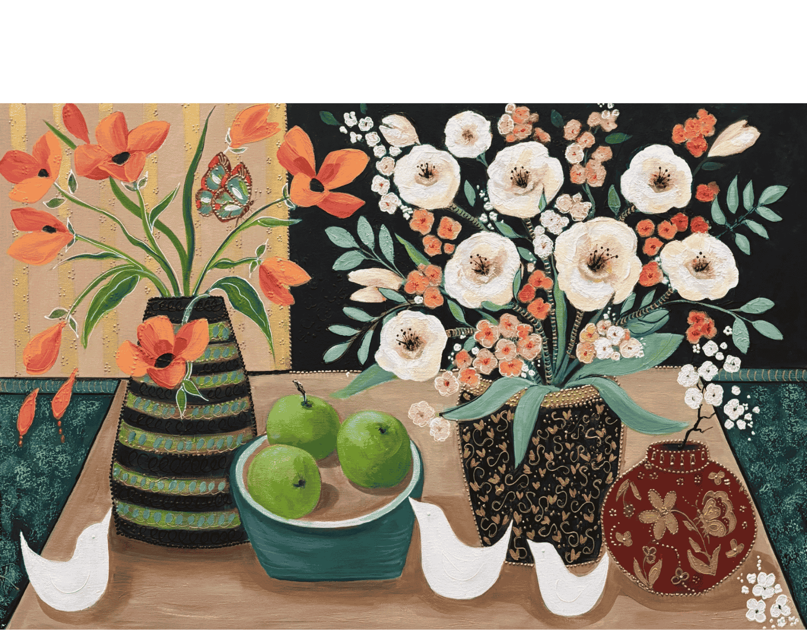 The spring flowers and the reappearance of birds, and the odd butterfly in the garden, led to this still life with apples and beautiful pots of flowers. The foreground objects are detailed with a contemporary feel. Gold details add a little glamour and the butterflies, there are two, add whimsy to the painting.