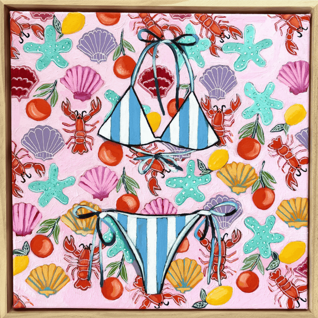 Having developed her artistry through an extensive degree of experimentation and a relinquishing of her creative inhibitions, Gabrielle began painting steadily in 2018,as a mechanism to cope with the grief that accompanied her mother’s passing. Commencing the creative process with initial pencil sketches that assist in establishing the works’ preliminary structure, the patterned aspects of each piece are typically determined first, prior to deciding which florals will balance and compliment the selected design. An avid collector of vintage vases, crockeries and linens, and particularly attracted to their clashing yet classical colour schemes, these items appear frequently within Gabrielle’s works, which are exclusively executed in acrylics on canvas.