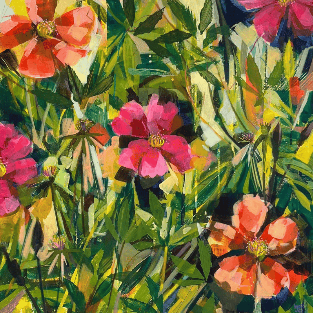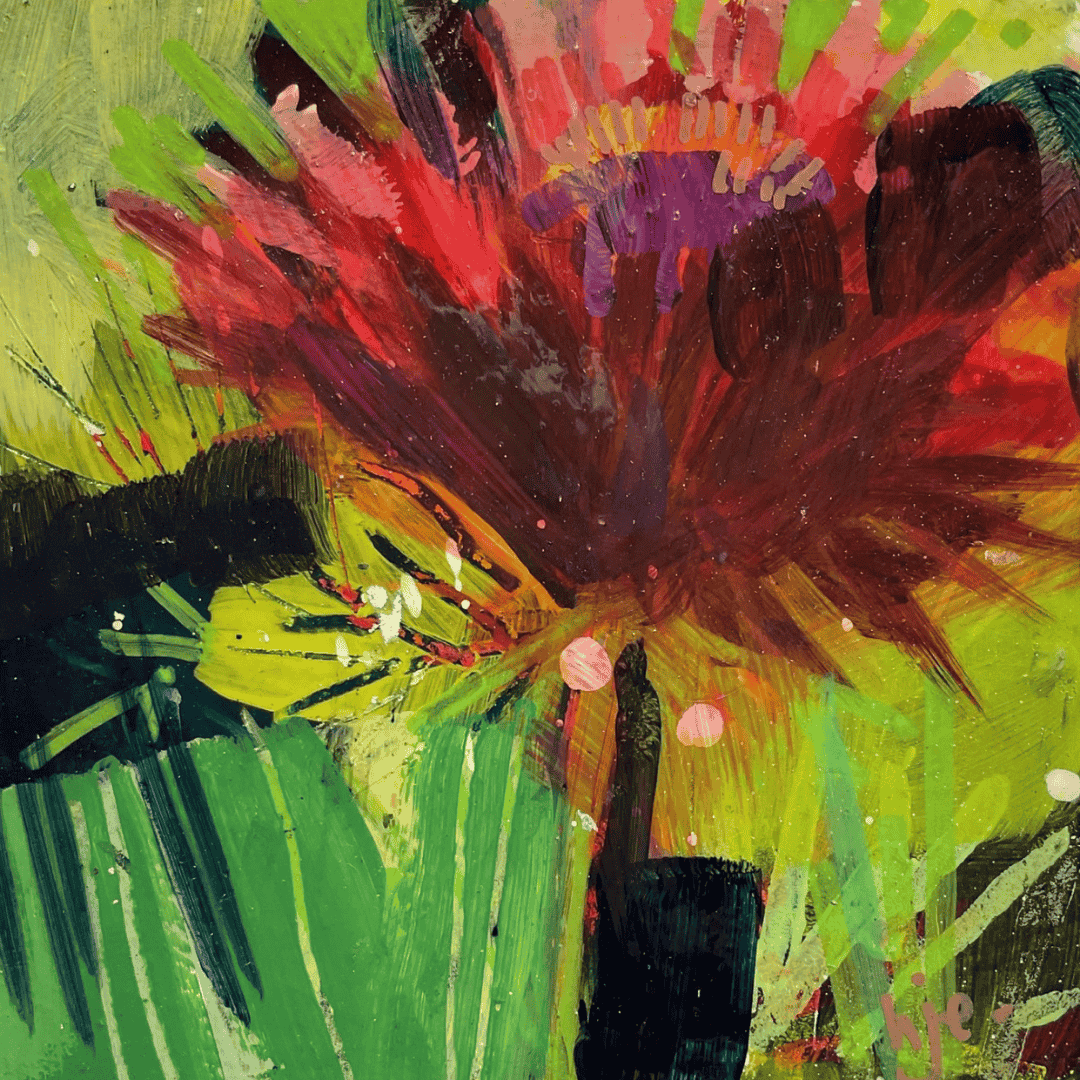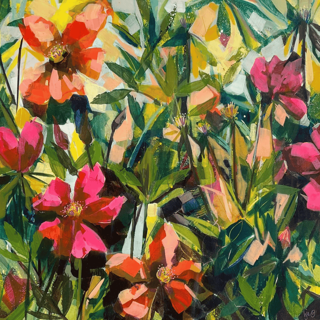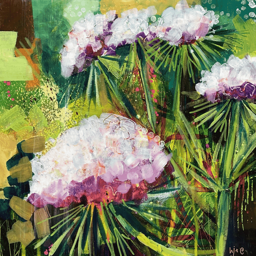 This richly layered acrylic painting is created on a sturdy wood panel and finished with three coats of gloss medium to bring out the depth of colour and texture. It’s presented in a hand-sanded pine float frame, waxed to a soft sheen that complements the work without overpowering it. The final surface is gently taken back with beeswax to a beautiful satin finish that catches the light just right.