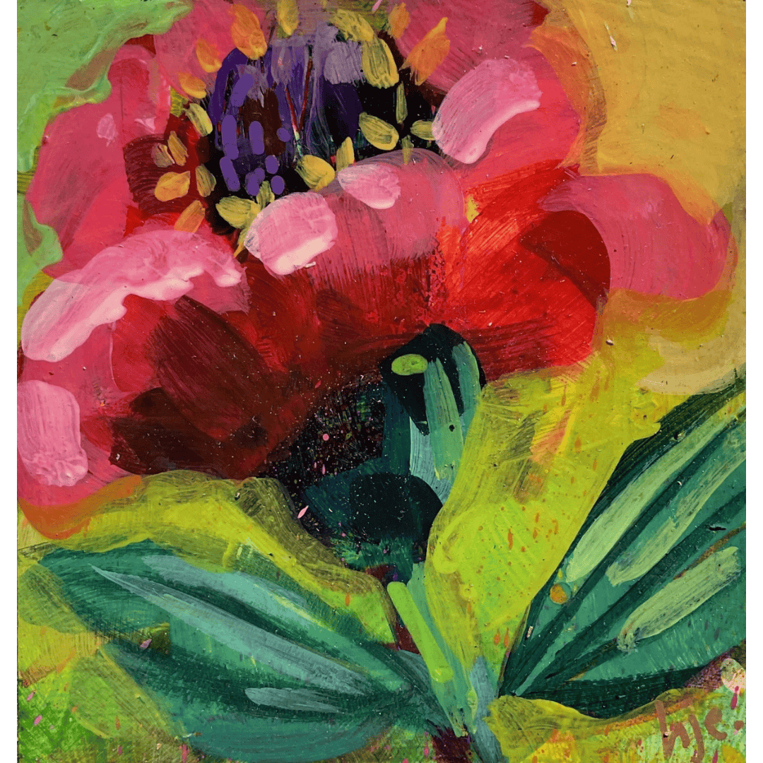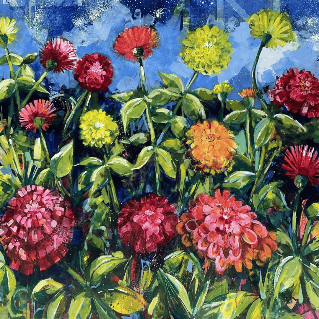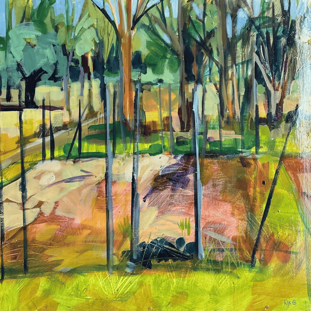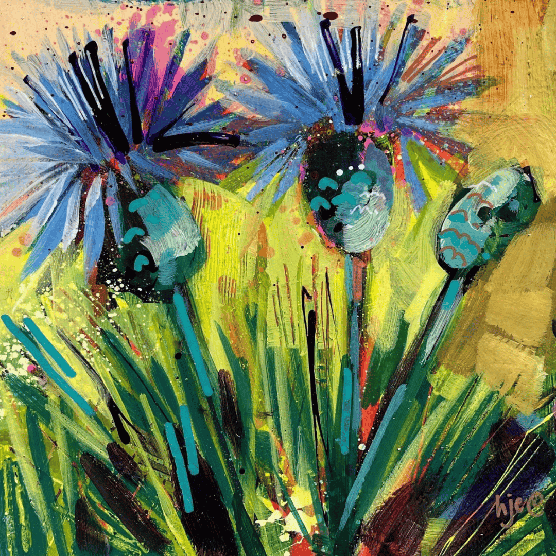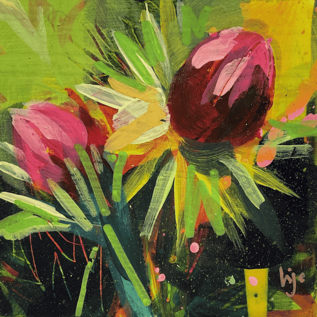 This richly layered acrylic painting is created on a sturdy wood panel and finished with three coats of gloss medium to bring out the depth of colour and texture. It’s presented in a hand-sanded pine float frame, waxed to a soft sheen that complements the work without overpowering it. The final surface is gently taken back with beeswax to a beautiful satin finish that catches the light just right.