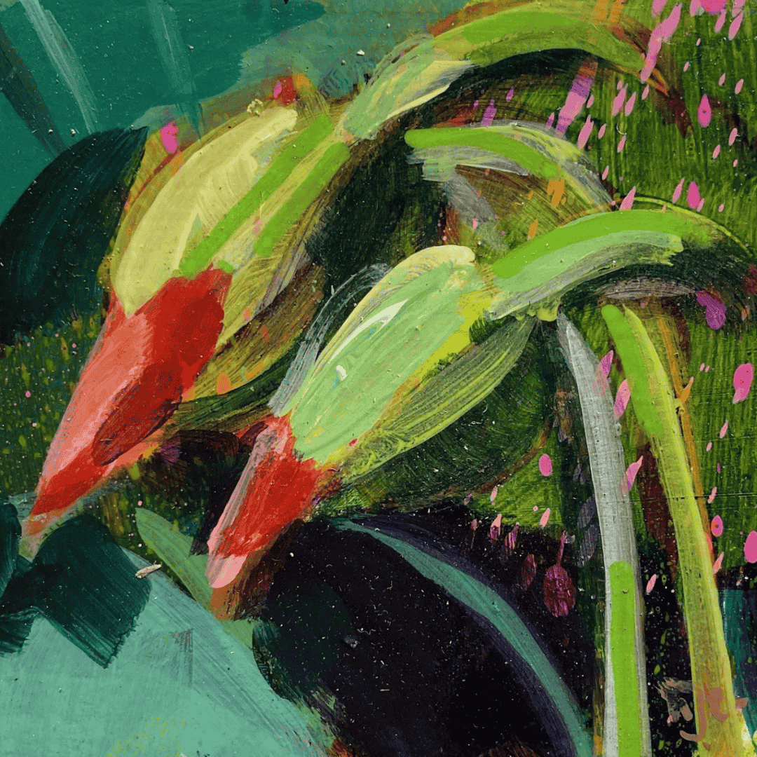 This richly layered acrylic painting is created on a sturdy handcrafted wood panel and finished with three coats of gloss medium to bring out the depth of colour and texture. It’s presented in a hand-sanded meranti float frame, waxed to a soft sheen that complements the work without overpowering it. The final surface is gently taken back with beeswax to a beautiful satin finish that catches the light just right.