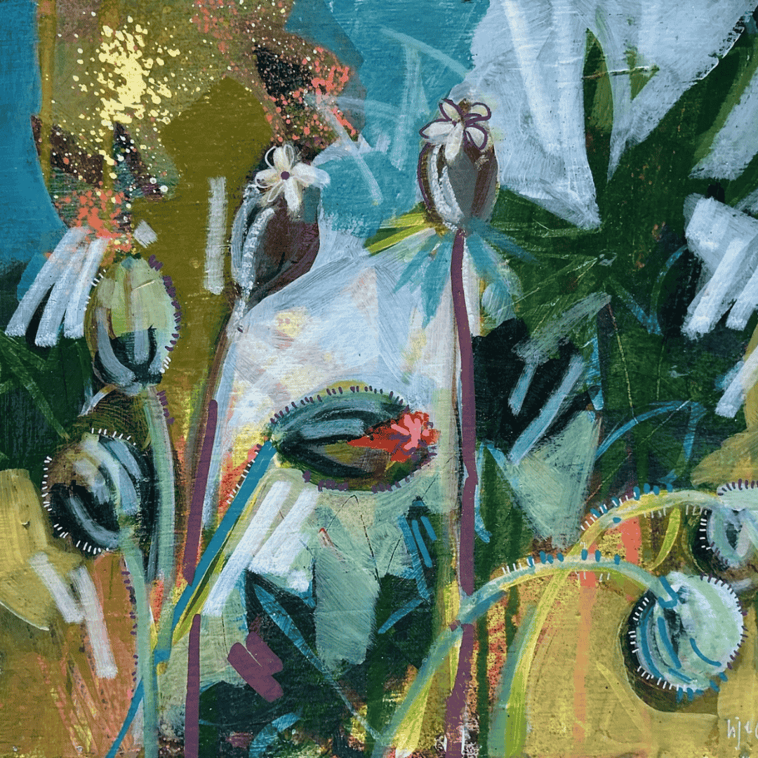 This richly layered acrylic painting is created on a sturdy wood panel and finished with three coats of gloss medium to bring out the depth of colour and texture. It’s presented in a hand-sanded meranti float frame, waxed to a soft sheen that complements the work without overpowering it. The final surface is gently taken back with beeswax to a beautiful satin finish that catches the light just right.