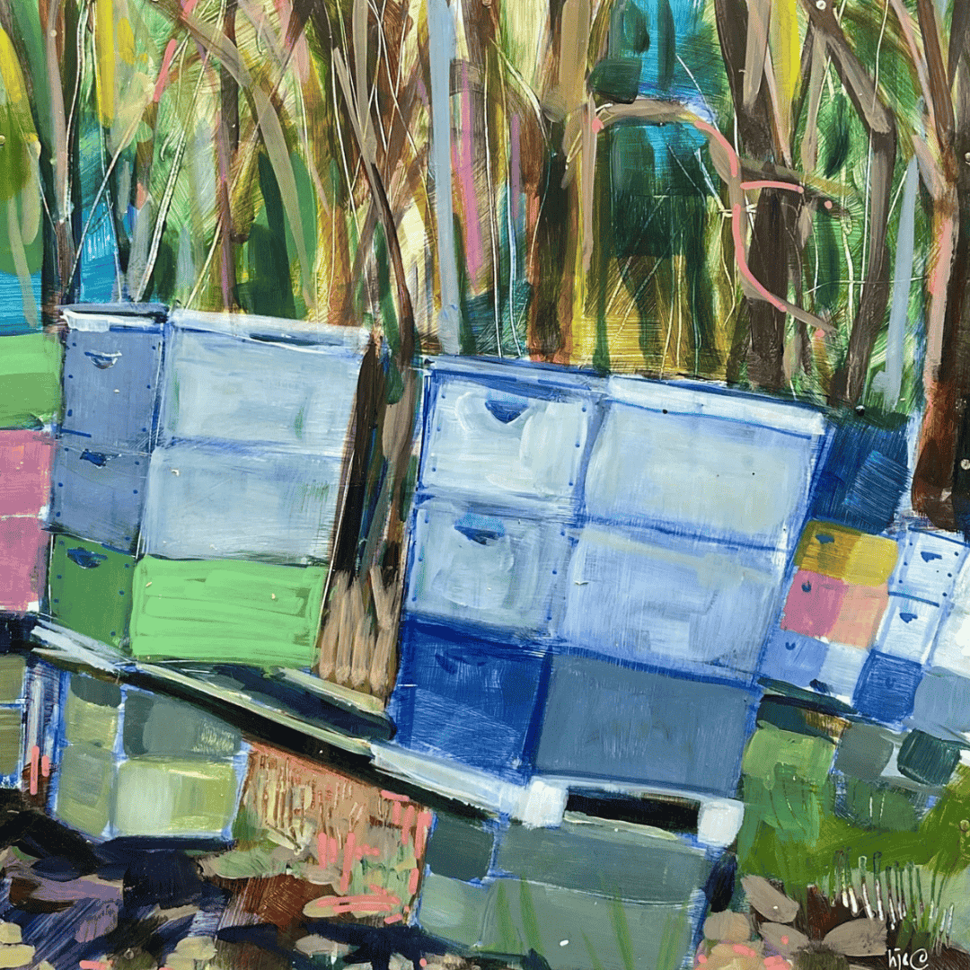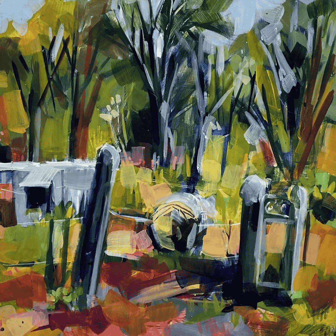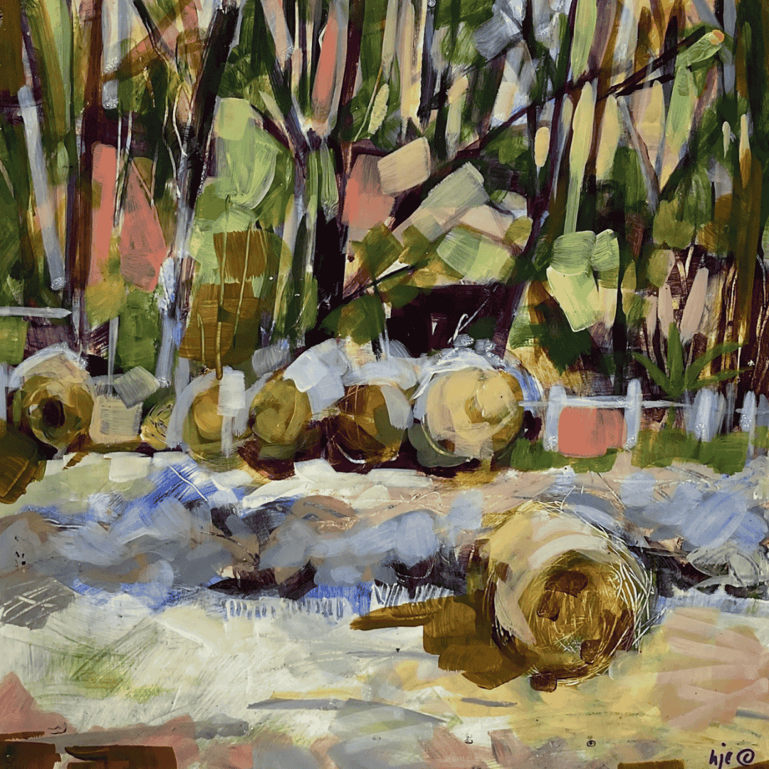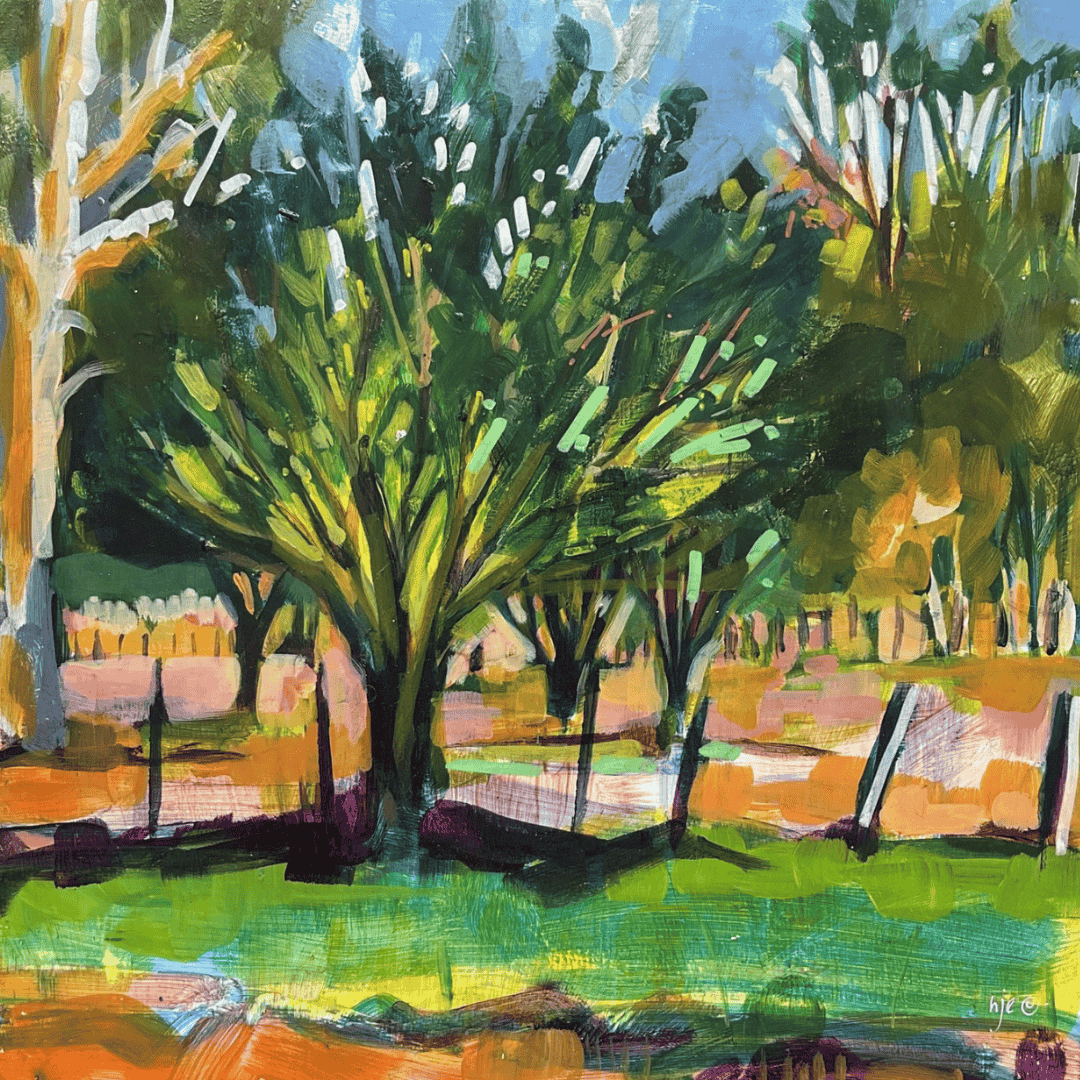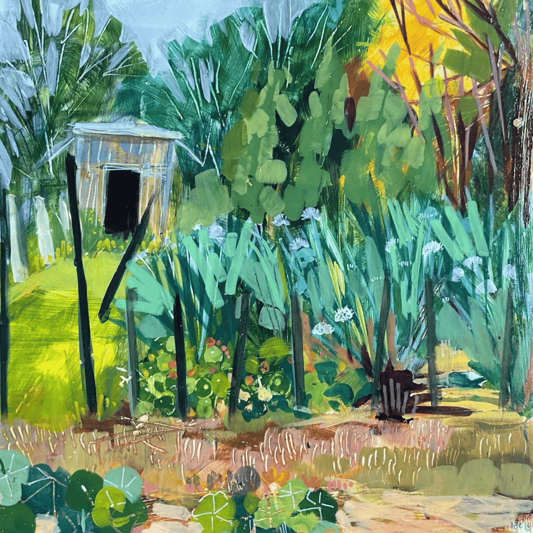 This series of paintings was created en plein air at The Acres, a working flower farm in Camp Mountain, northwest of Brisbane, during my 2023–24 residency. I spent two to three days each week drawing and painting directly from the landscape, capturing the changing light, textures, and rhythms of the farm. The evolving seasons, weather, and farm structures—fences, flower beds, and posts—offered endless inspiration and compositional elements.