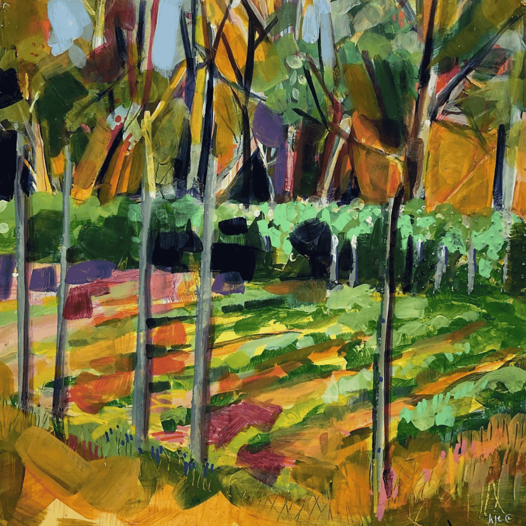 This richly layered acrylic painting is created on a hand-constructed sturdy wood panel and finished with three coats of gloss medium to bring out the depth of colour and texture.