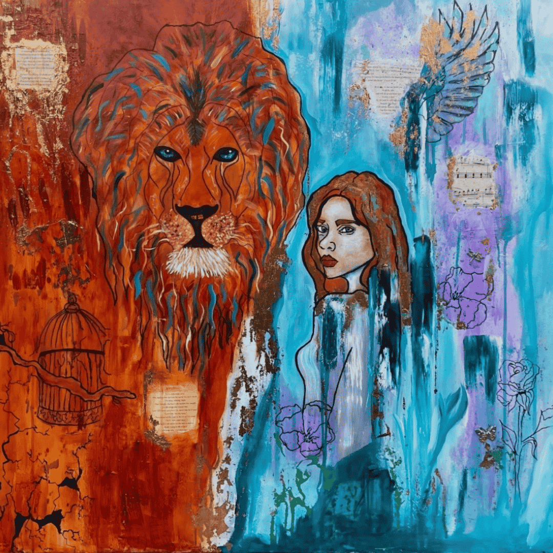 For this piece, I chose to work primarily with transparent high flow acrylics to preserve the drawings, while also adding expressive, primal energy with bold hues like red iron oxide and phthalo turquoise. To add dimension, and an element of raw, unpolished texture, I used layers of modeling paste and heavy gloss gel. Collaged within the painting are excerpts from poems, songs or devotionals which add to the story of "Untamed."