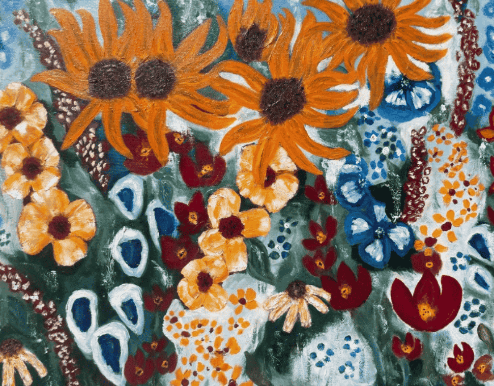I find myself gravitating towards flowers on a daily basis, fascinated by their delicate beauty, intricate details and breathtaking hues. But while viewing flowers with my 2 year old niece, I stumbled upon a childlike joy and wonder that shifted my perspective. Instead of straining and striving to recreate every technical detail of each complex bloom, what if I gave myself the freedom to recreate the essence of these florals, the life and joy and wonder and vibrance we saw in the world as children. I allowed myself to dream vivid dreams of colorful flowers, as I wanted to see them. “Dreams in Bloom” is a primal, passionate expression of vernal beauty and chromatic catharsis. My hope is that others out there who are looking to heal out loud and prefer vibrant hues over hushed tones, will be inspired to nurture their own dreams and let them bloom.