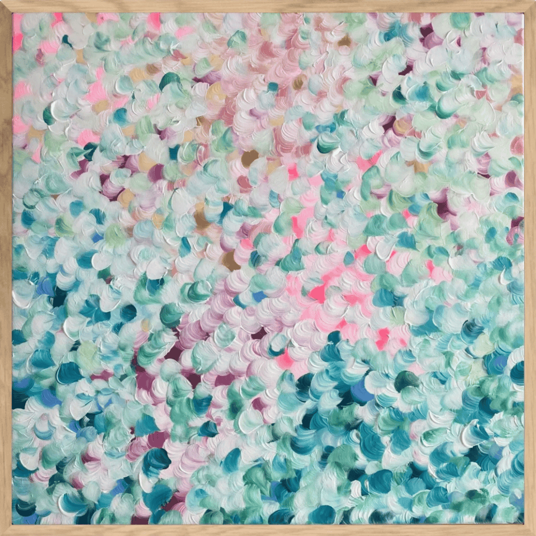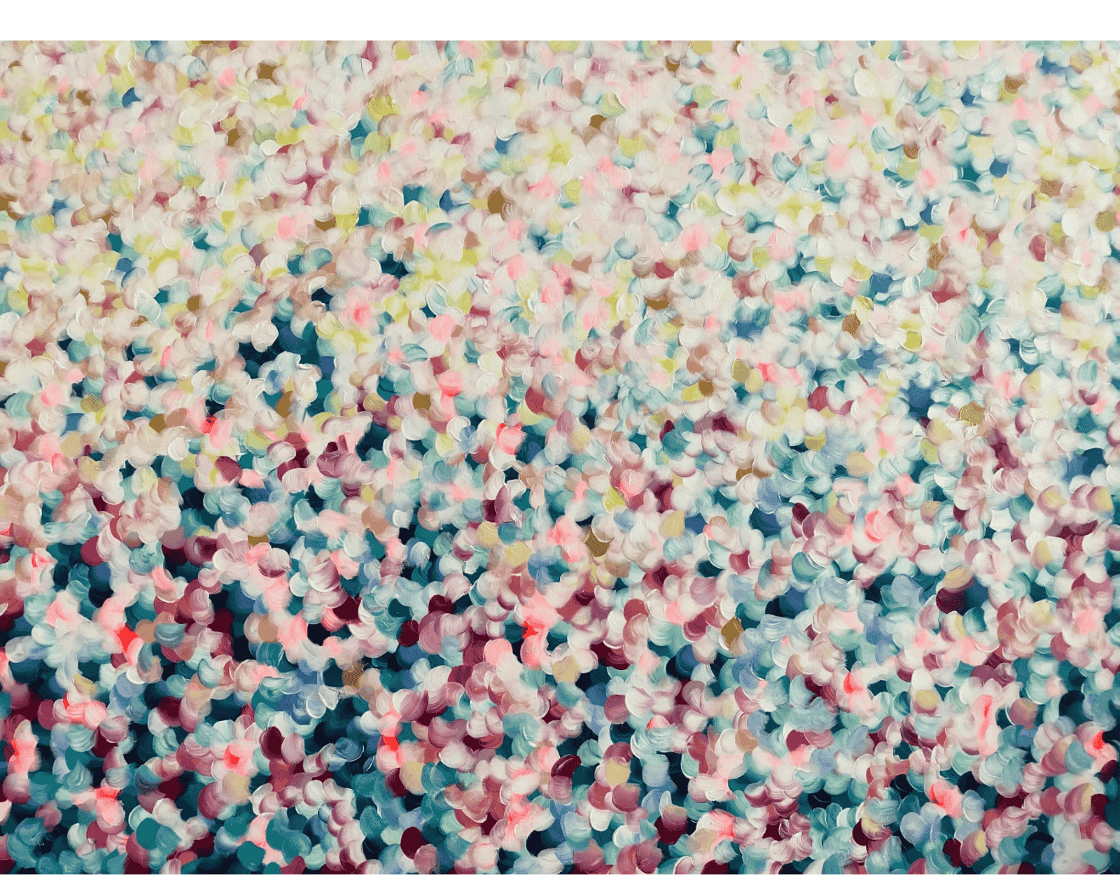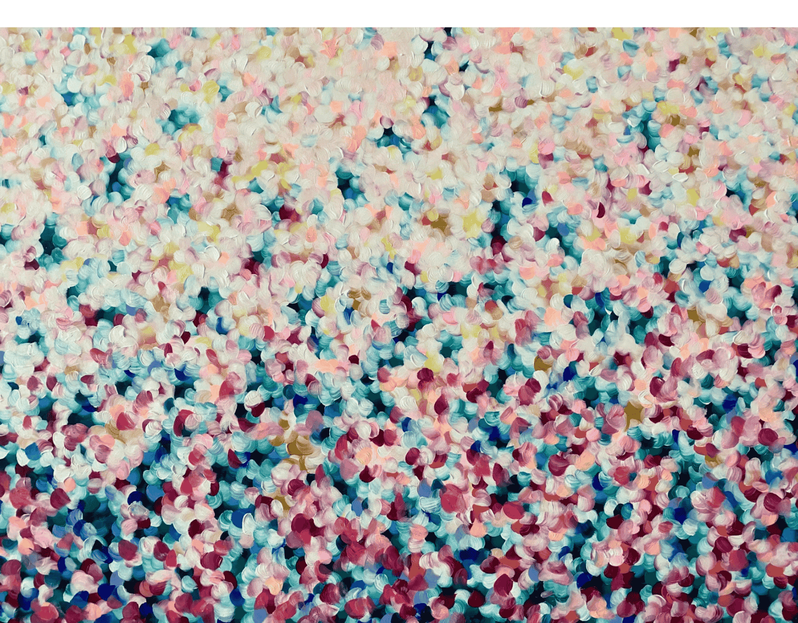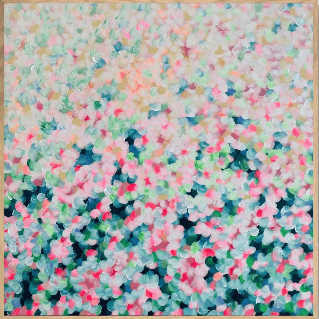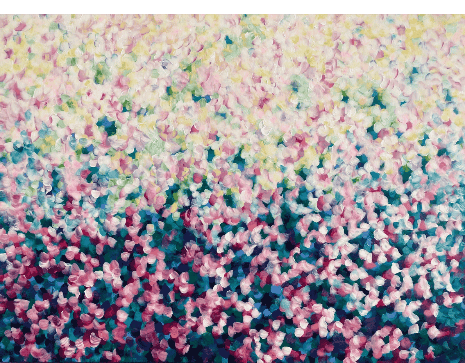 This painting is an abstract expressionist piece characterised by a textured surface of colourful brushstrokes. The strokes are rounded and layered, resembling flower petals scattered across the canvas. The colour palette consists of soft pastels and deeper shades with splashes of magenta. The overall effect is vibrant and dynamic, evoking a sense of movement and depth. The painting conveys an impressionistic, dreamlike quality, reminiscent of a field of flowers in spring.