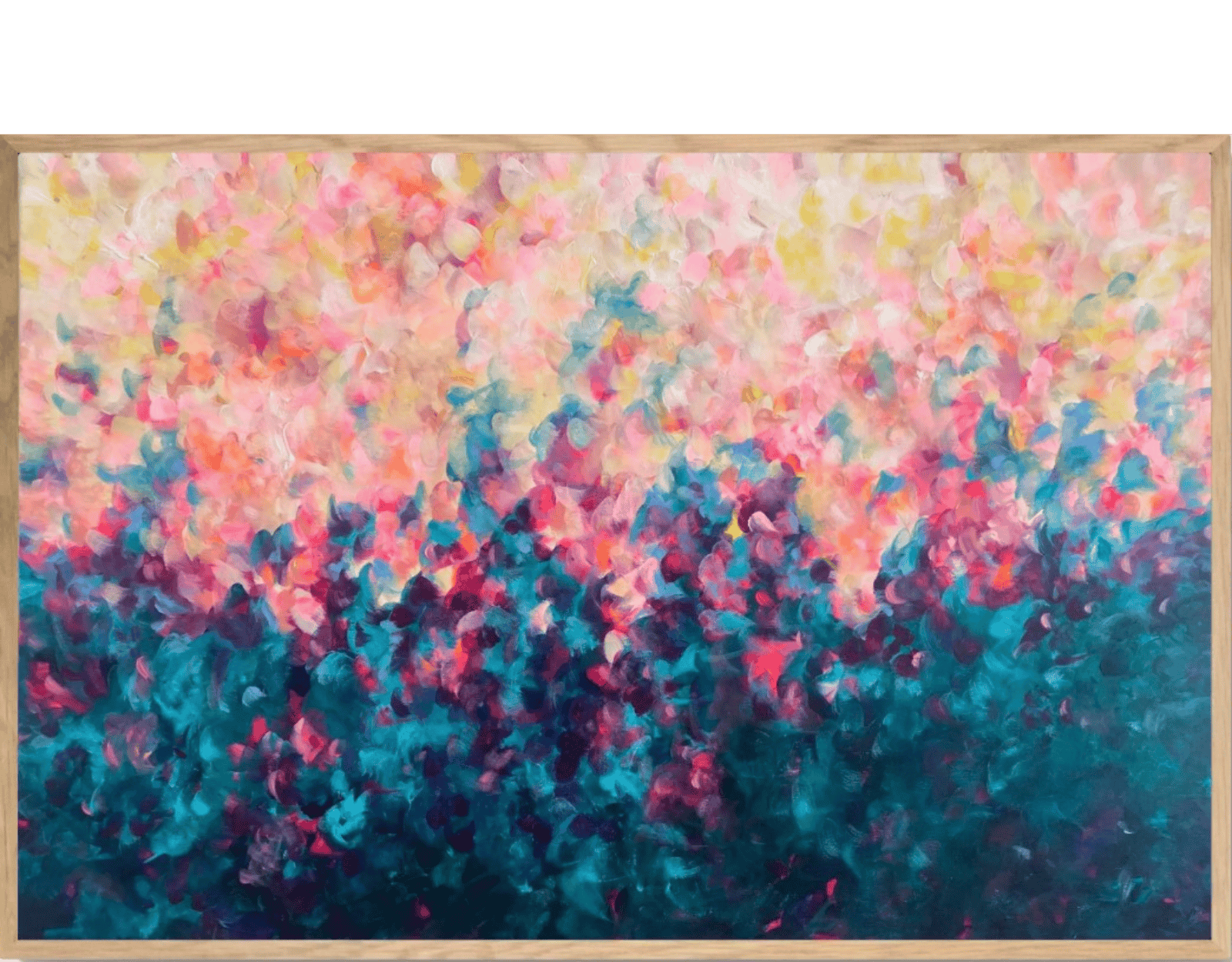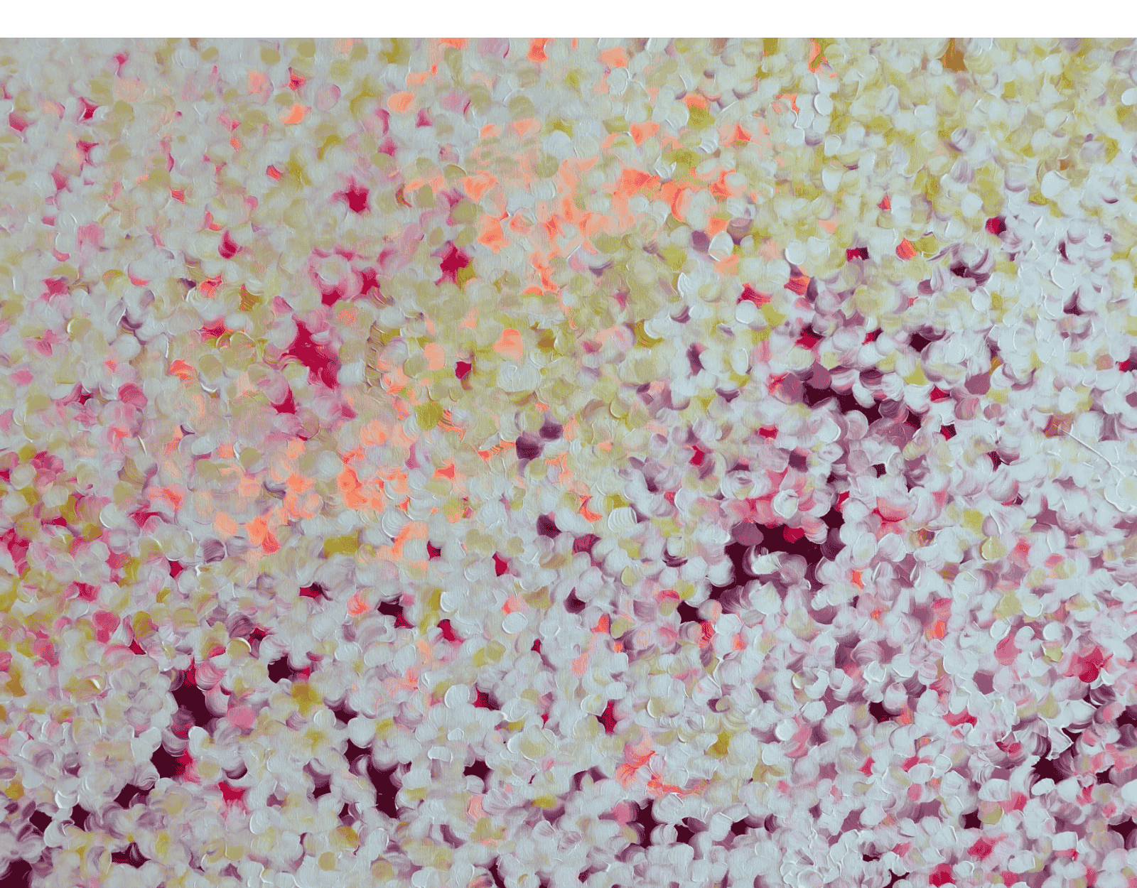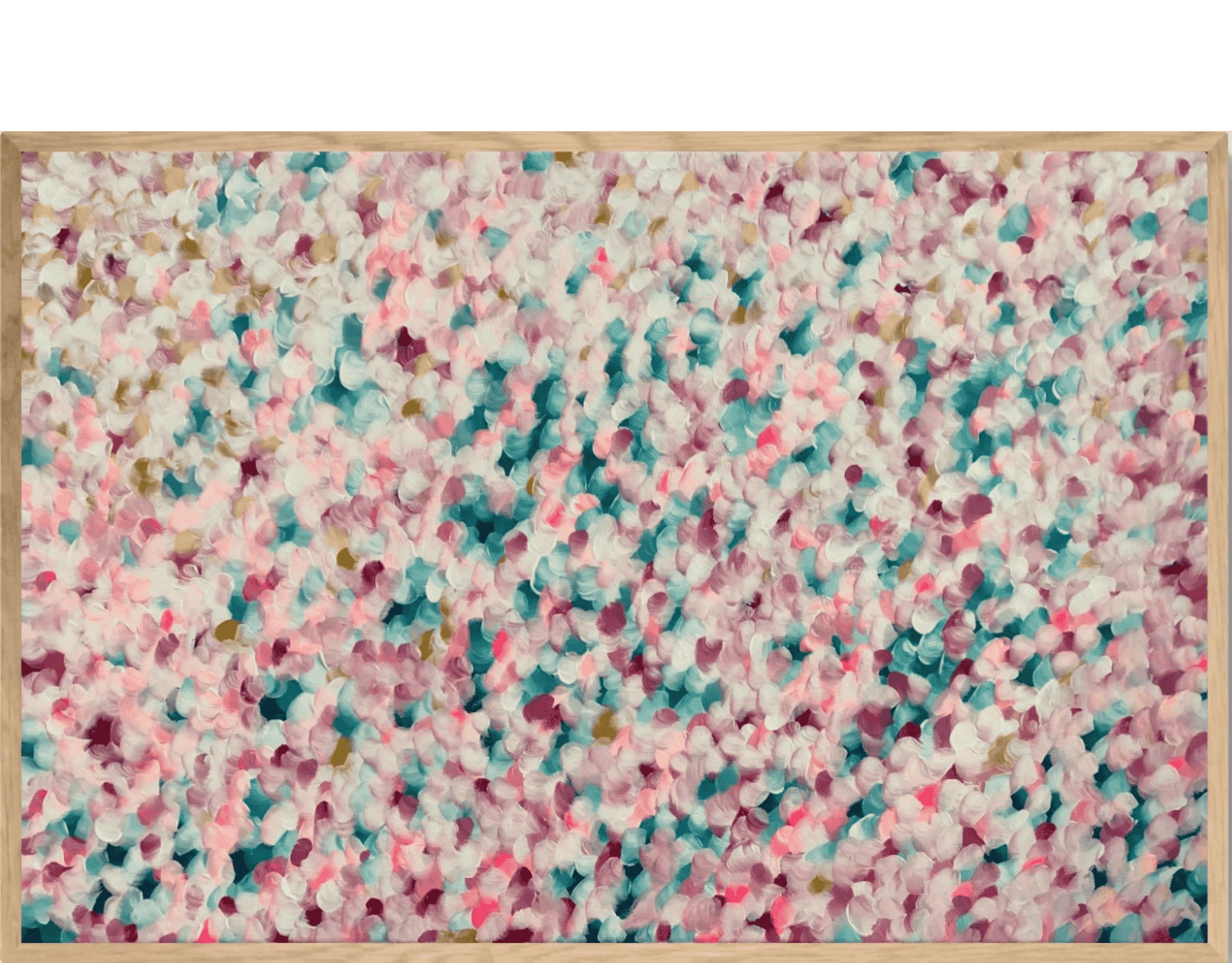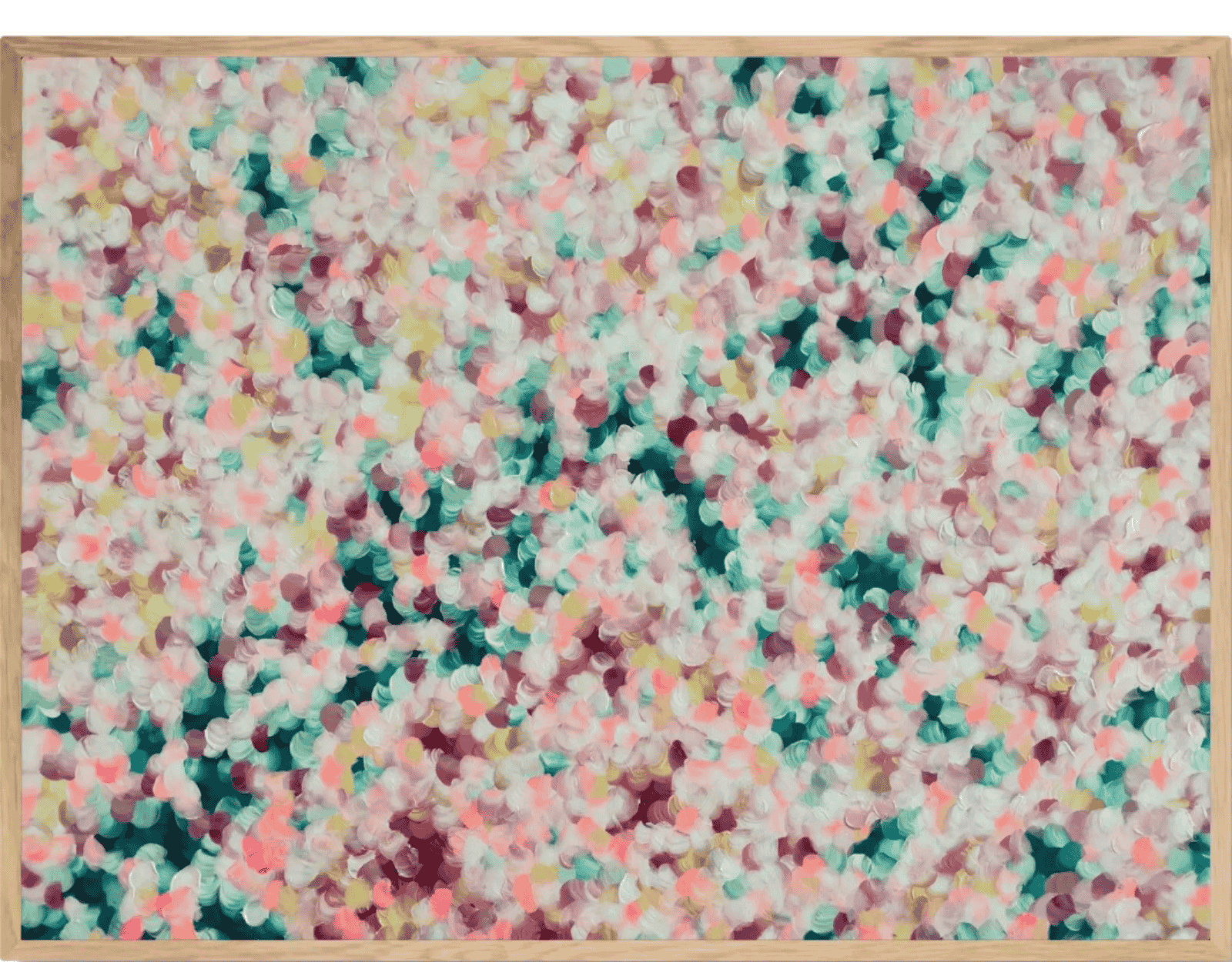 This painting is an abstract expressionist piece characterised by a textured surface of colourful brushstrokes. The strokes are rounded and layered, resembling flower petals scattered across the canvas. The colour palette consists of soft pastels and deeper shades with splashes of magenta. The overall effect is vibrant and dynamic, evoking a sense of movement and depth. The painting conveys an impressionistic, dreamlike quality, reminiscent of a field of flowers in spring.
