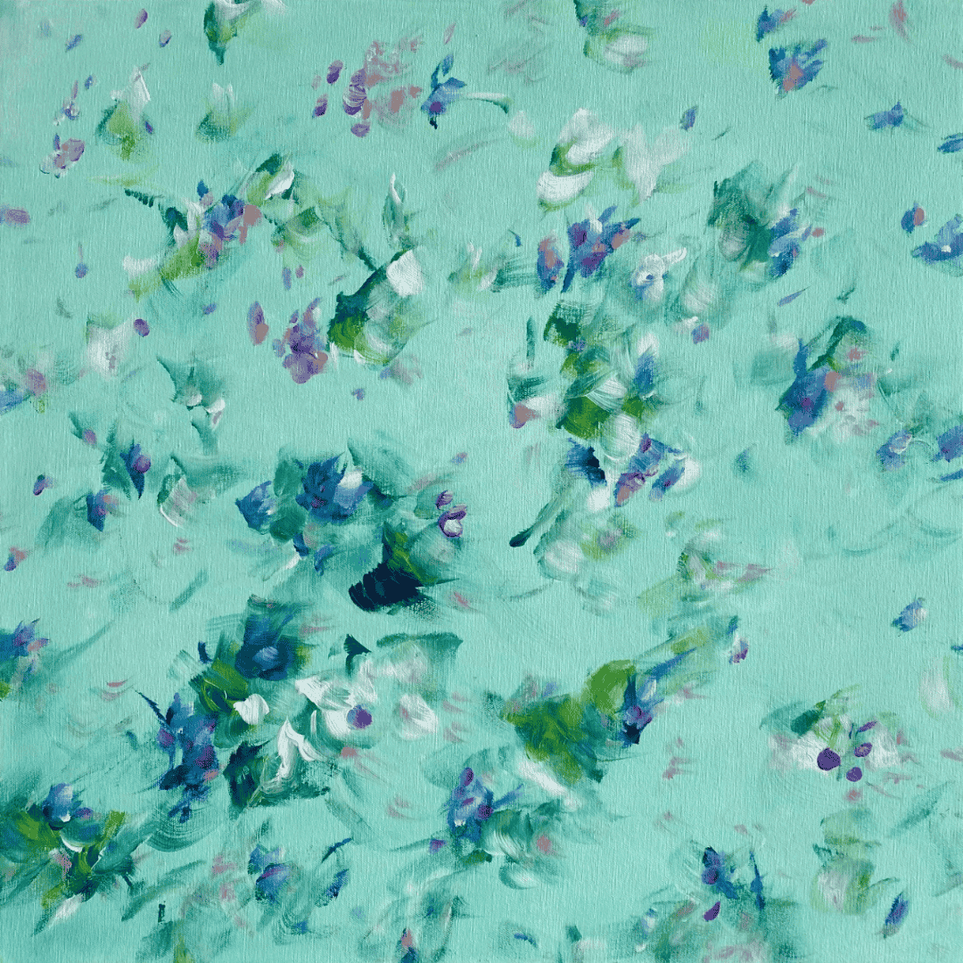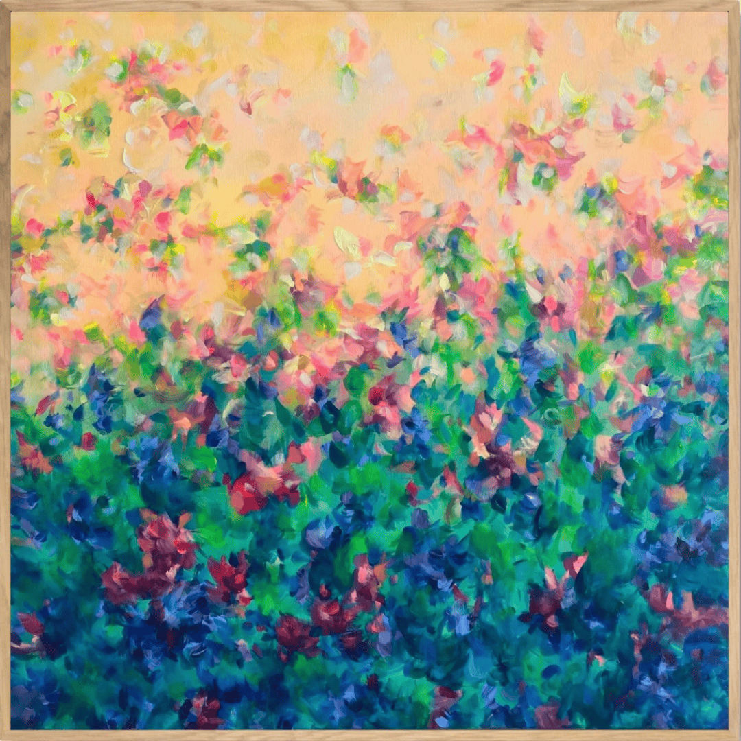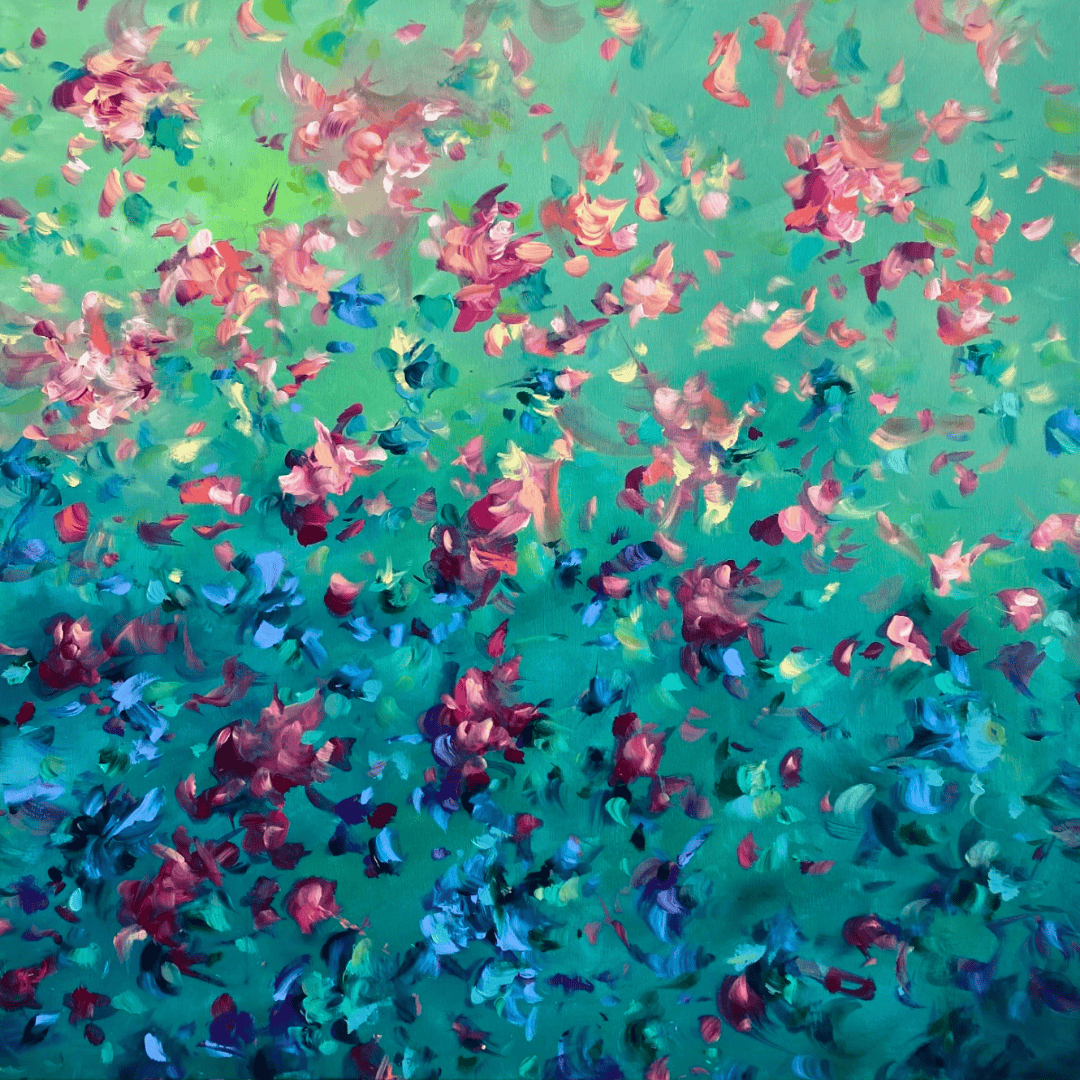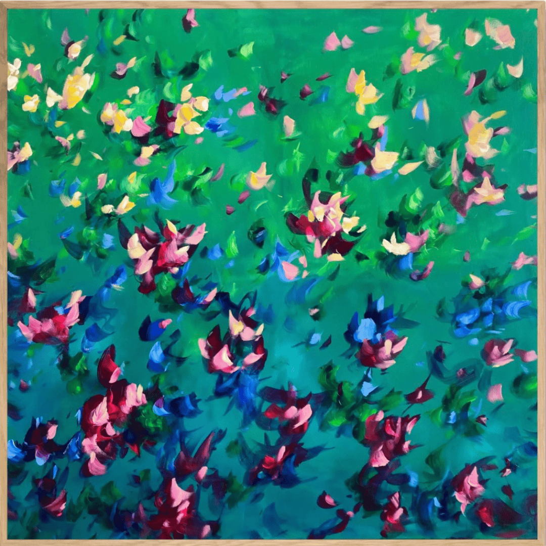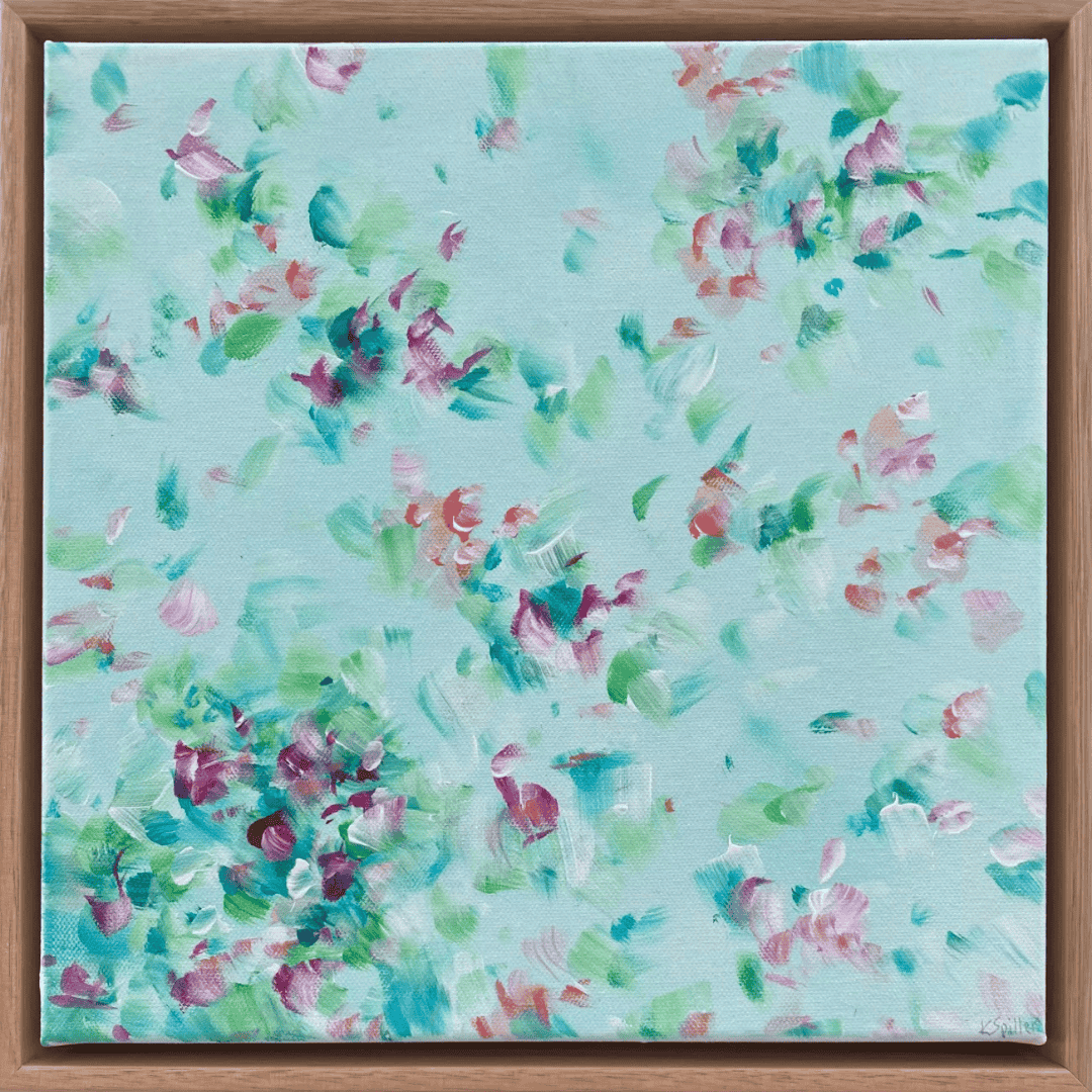Delight in the joy of flowers everyday. Petals float and dance in this pretty abstract work.