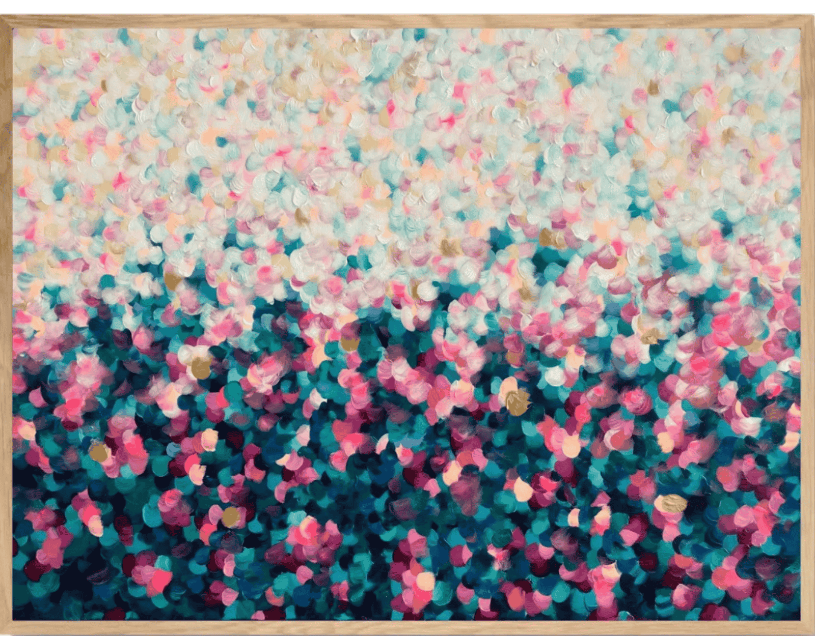 This painting is an abstract expressionist piece characterised by a textured surface of colourful brushstrokes. The strokes are rounded and layered, resembling flower petals scattered across the canvas. The colour palette consists of soft pastels and deeper shades with splashes of gold. The overall effect is vibrant and dynamic, evoking a sense of movement and depth. The painting conveys an impressionistic, dreamlike quality, reminiscent of a field of flowers.