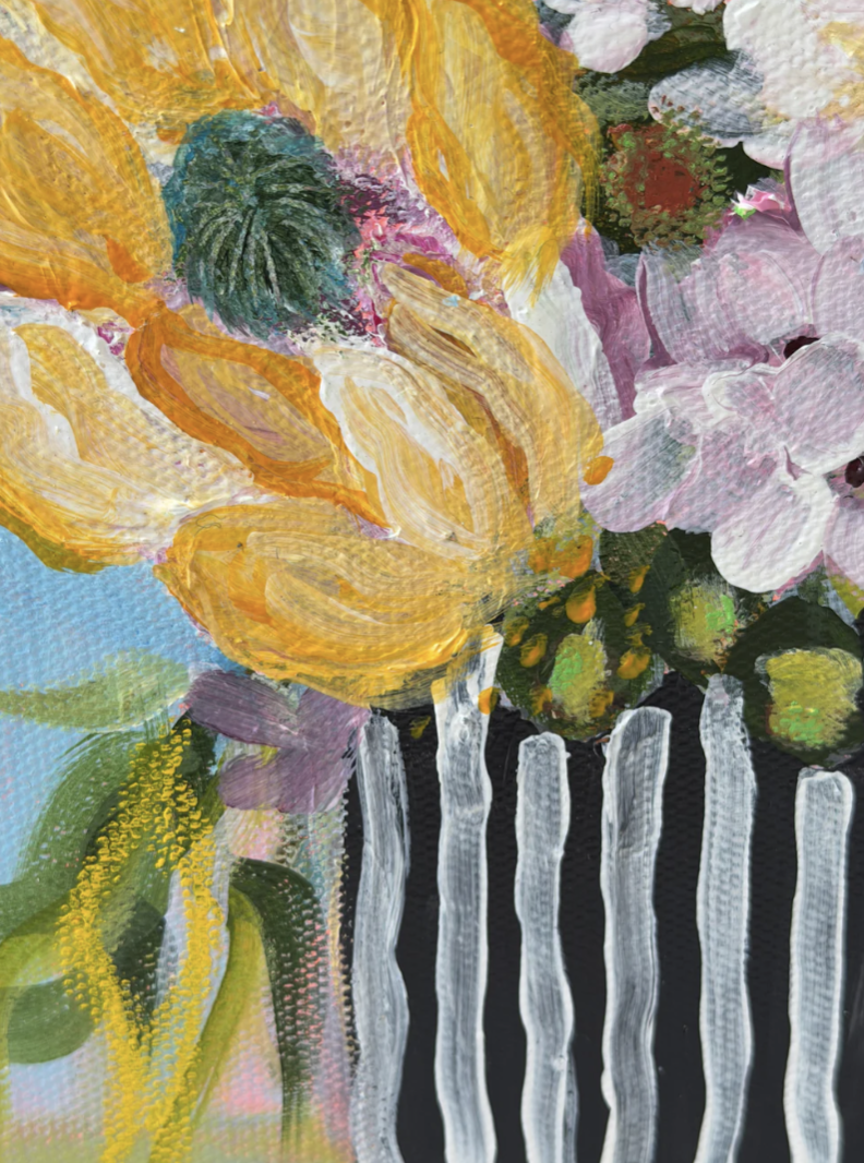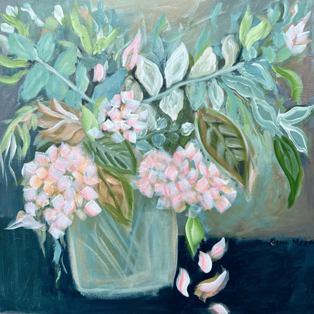 The inspiration for this piece came from the small artworks that I had created during an art challenge. I was exploring different colour palettes and floral styles. I am very pleased that the art challenge helped me take another step forward in developing my style.