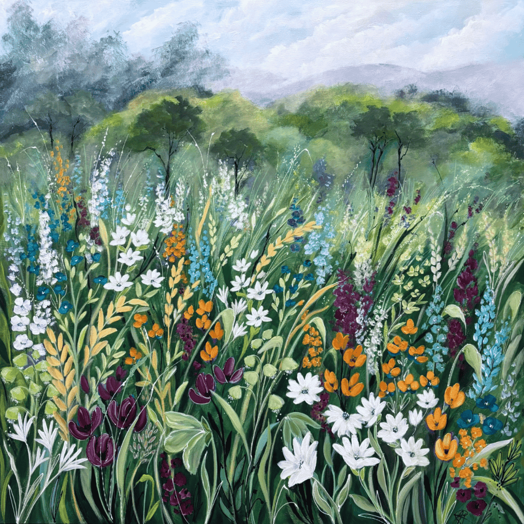 This painting is the next in The Field of Flowers series. I’ve used the bushland of north eastern Tasmania as the inspiration. The field is set amongst the rolling hills, the sky full of clouds. The flowers are intertwined amongst the grasses and leafy foliage, making a splendid statement about the colours of spring.