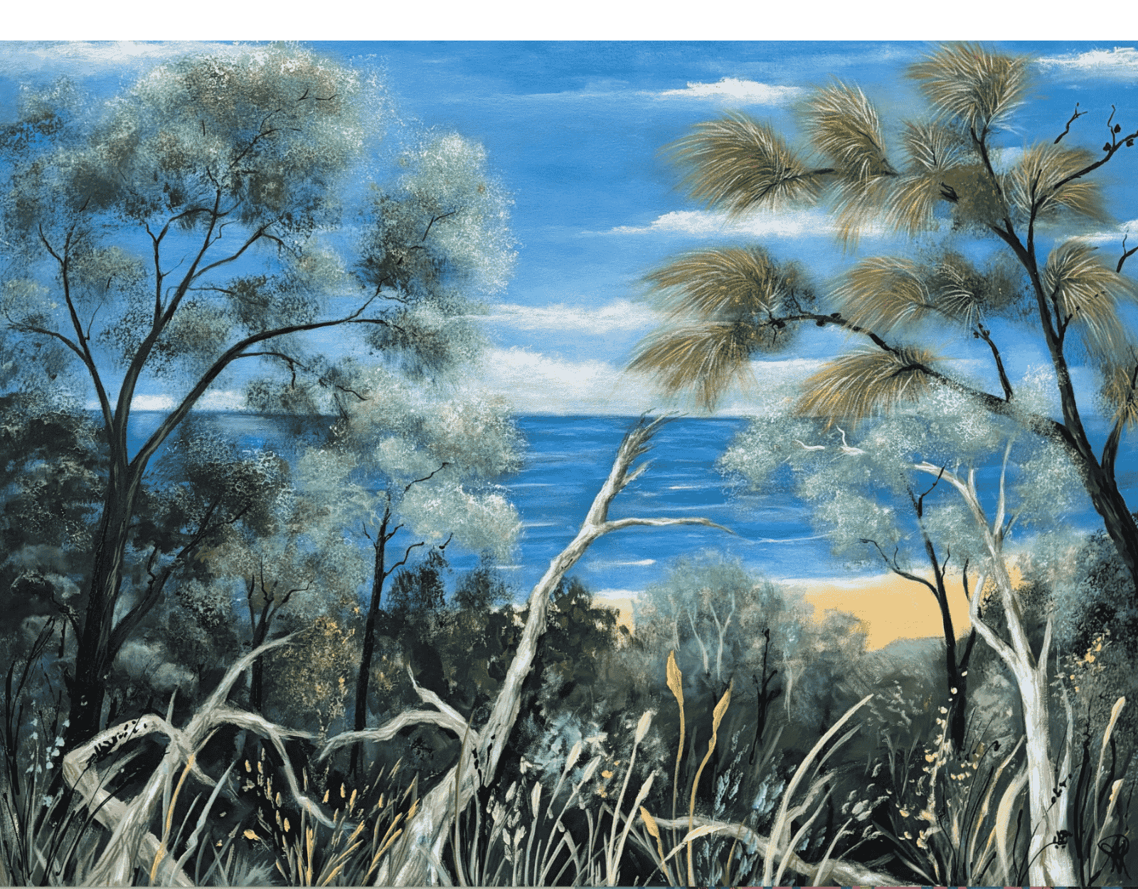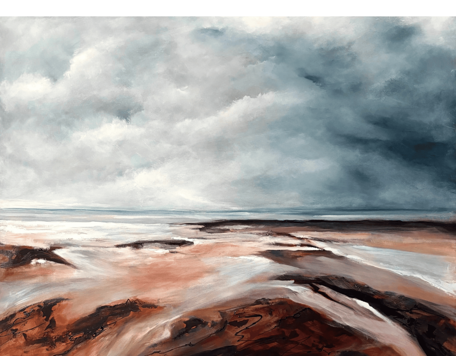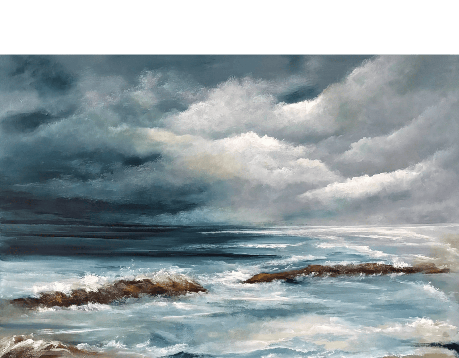 The Peninsula ocean beaches provide the most stunning array of sea and sky vistas. This semi abstract painting depicts a rare time of tranquility after the passing of the storm. The sky gradually clears, the light returns, and there are reflections on the sea and pools that seem to signal that calm has returned.