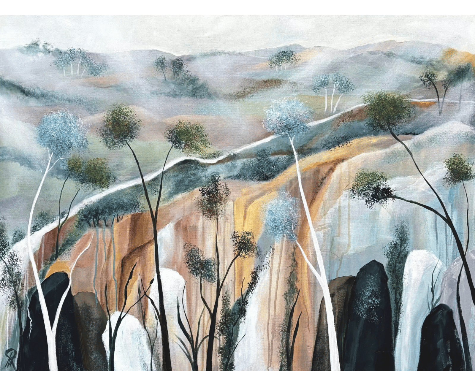 Walking the High Country hills around Mount Buffalo provides a plethora of amazing views. This painting is a semi abstract impression of the area where water runs over rocks and hillsides, and where the hills and mountains disappear into the mist.