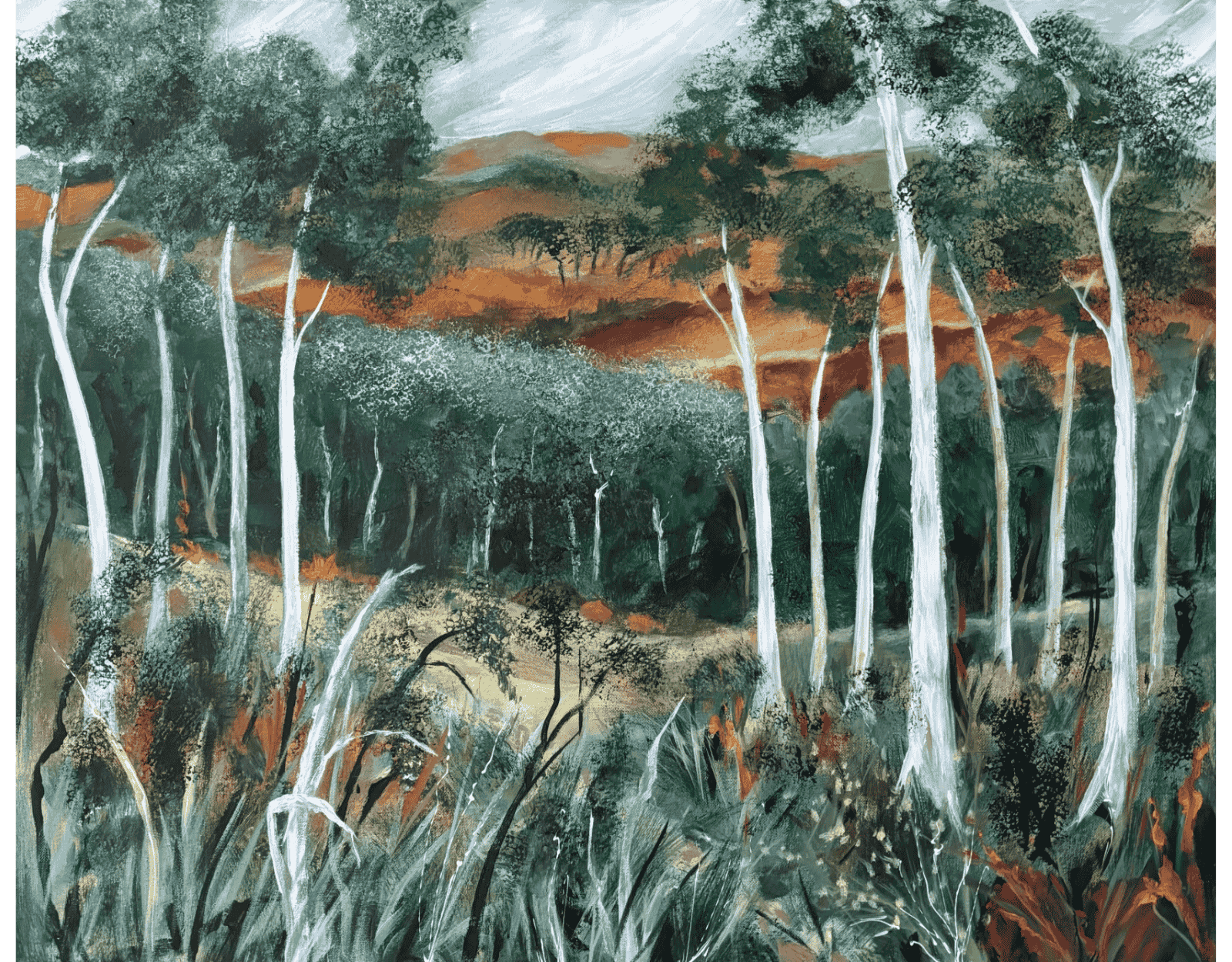 Abstract landscapes are the paintings I love to work with because of the amazing depth and breadth of our beautiful land. Storm Moving In arose from a collection of photos taken years ago in High Country Victoria. I’ve pulled together the stormy sky, undulating hills and ravines with aspects of the bushland to give an abstract expression of our country. There is a little texture but the overall finish is smooth.