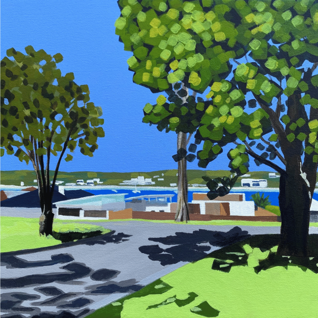 This modern depiction of a boat shed on the river is a scene I have painted before. Using a reference photo I took at Como in Sydney's Sutherland Shire, this fourth painting is bright and fun with its simple lines and somewhat muted tones that still allow a level of brightness and colour. The stillness of the water is calming and the reflection adds to the holiday, restful vibe of life on the water, particularly with the tall palm trees towering over the boat shed.