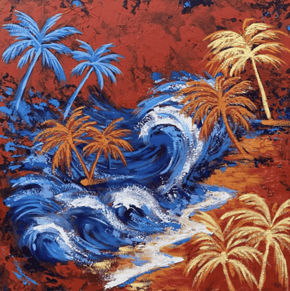 This original acrylic painting brings tropical chaos to life, with powerful, swirling blue waves crashing against a fiery landscape. Palm silhouettes sway against the heat-soaked backdrop, capturing the energy of a coastline in upheaval.Painted in an expressive, impasto style with bold palette knife textures and sweeping brushwork, ‘Heatwave Breaker’ fuses abstract expressionism with vibrant contemporary art.