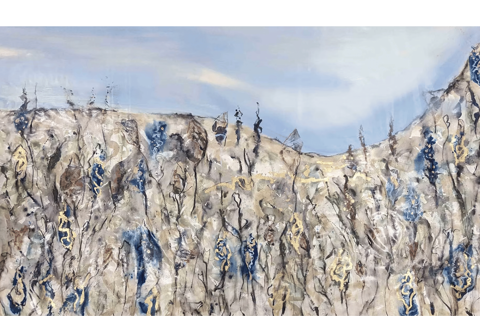 I have used metallic gold gilding through the painting which changes in the light. There are areas of translucent collage creating abstract tree forms and detailing of rocks and plants in charcoal.