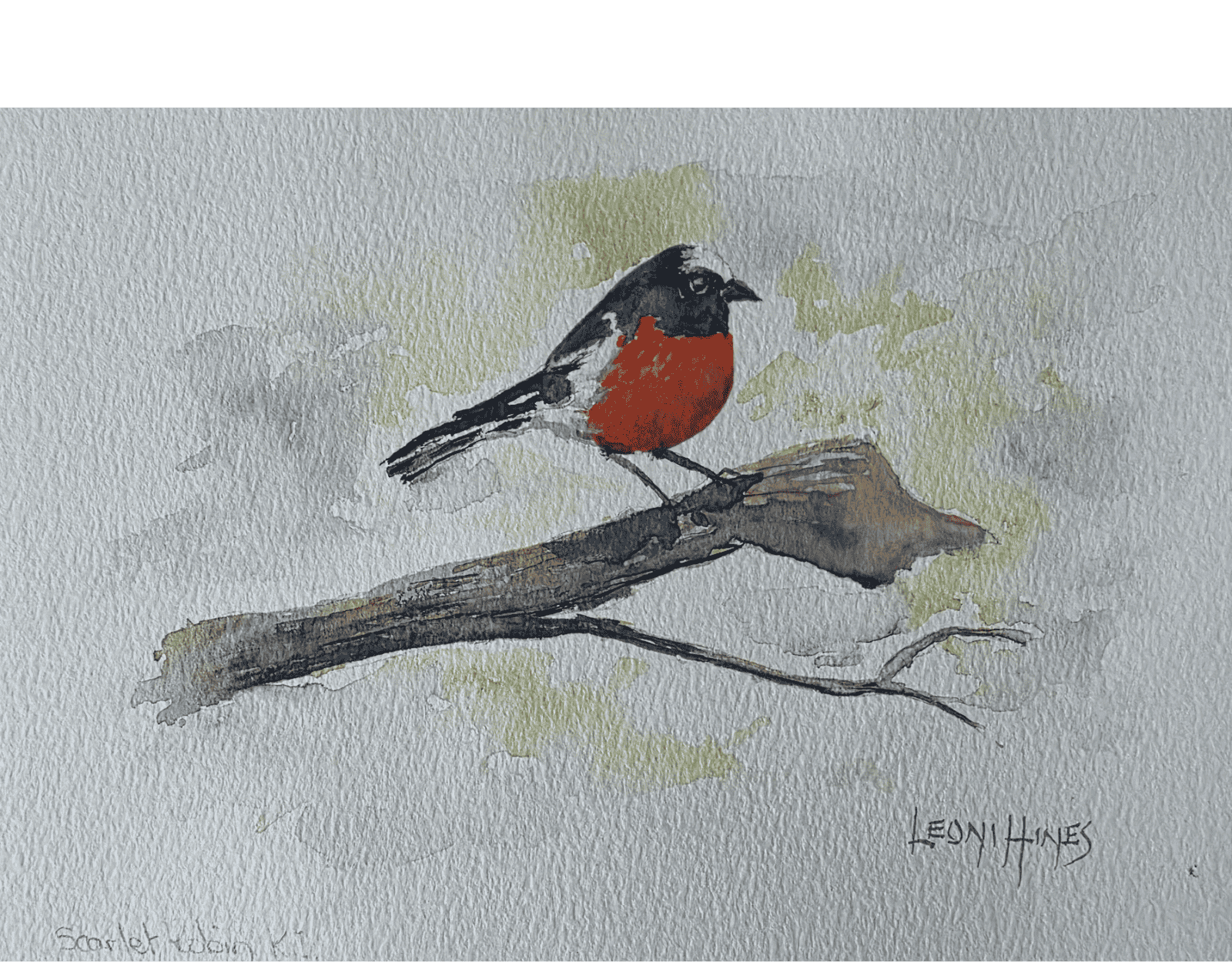 Delicate layers of transparent colour create a dreamy, atmospheric effect, allowing the bird’s vivid scarlet chest to glow softly against the muted background. The loose, fluid brushwork enhances the sense of calm and lightness, making this piece perfect for anyone who loves Australian birds, botanical art, or peaceful nature scenes.