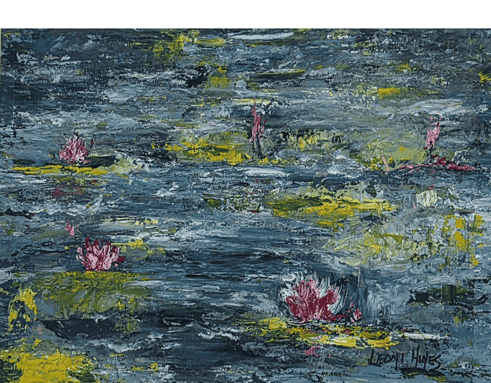Rich texture, layered colour and expressive mark-making create a lively, abstract–impressionistic surface that draws the viewer into the movement of the water and the delicate blooms rising from it.