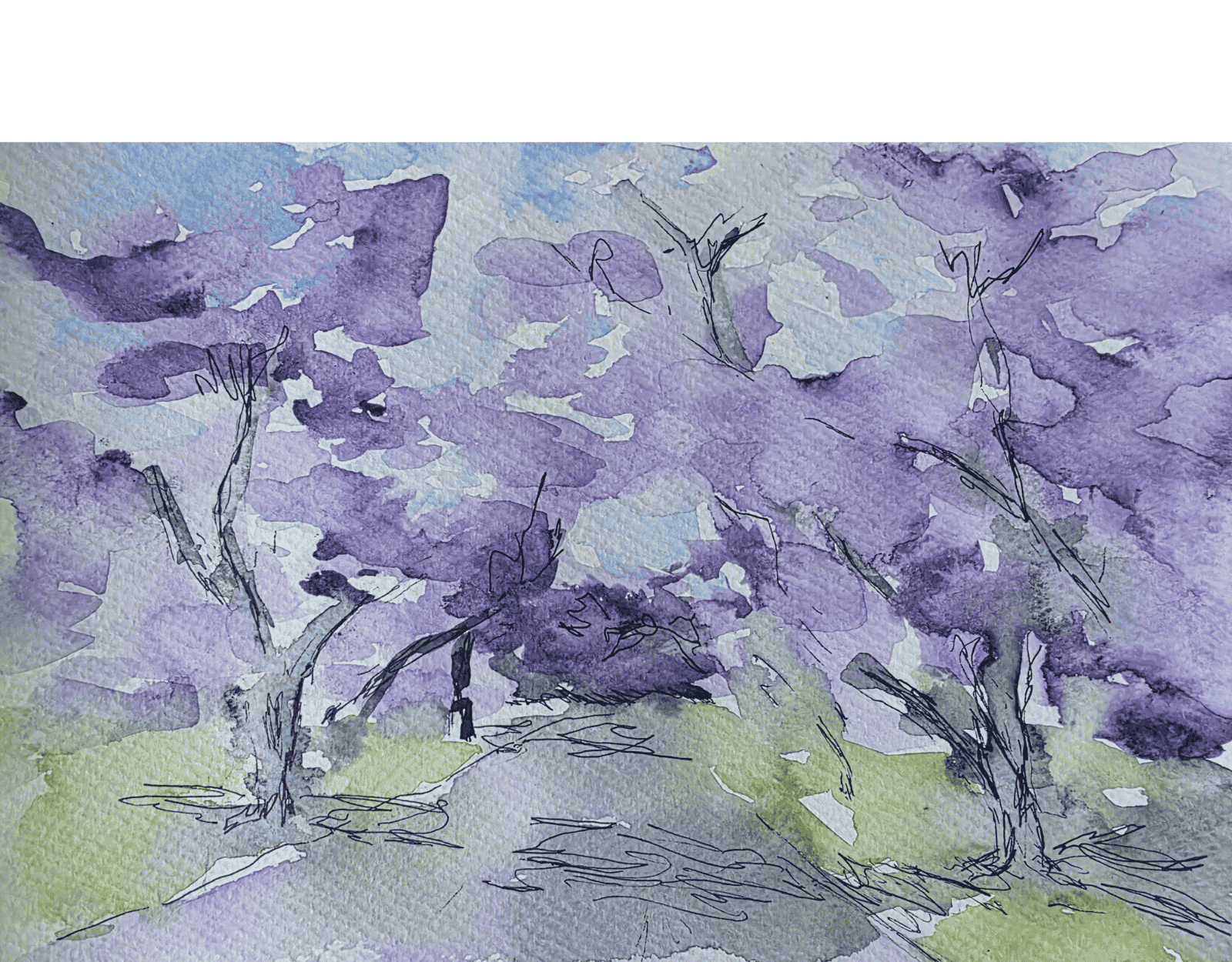 Jacaranda Lane 02 is an original watercolour painting capturing a quiet Australian street, where soft morning light filters through the jacaranda trees in bloom.