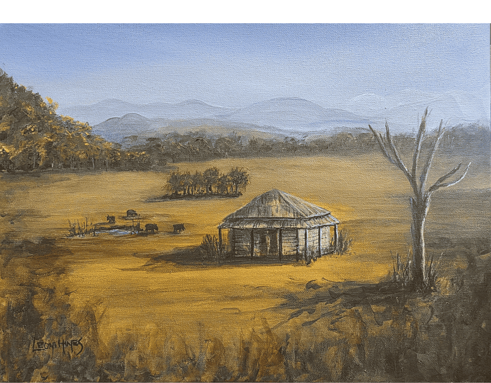 Wellards Lane is an original plein air acrylic painting, painted on location near Gloucester, NSW. This rural landscape captures the quiet beauty of the Australian countryside. A rustic hut, leafless tree and grazing cattle evoke a timeless pastoral scene, while the distant Bucketts mountain range anchors the composition with majestic calm. Created in a single day to preserve the shifting light and shadow, this piece is perfect for collectors seeking authentic Australian landscape art, with a sense of place and tranquility.
