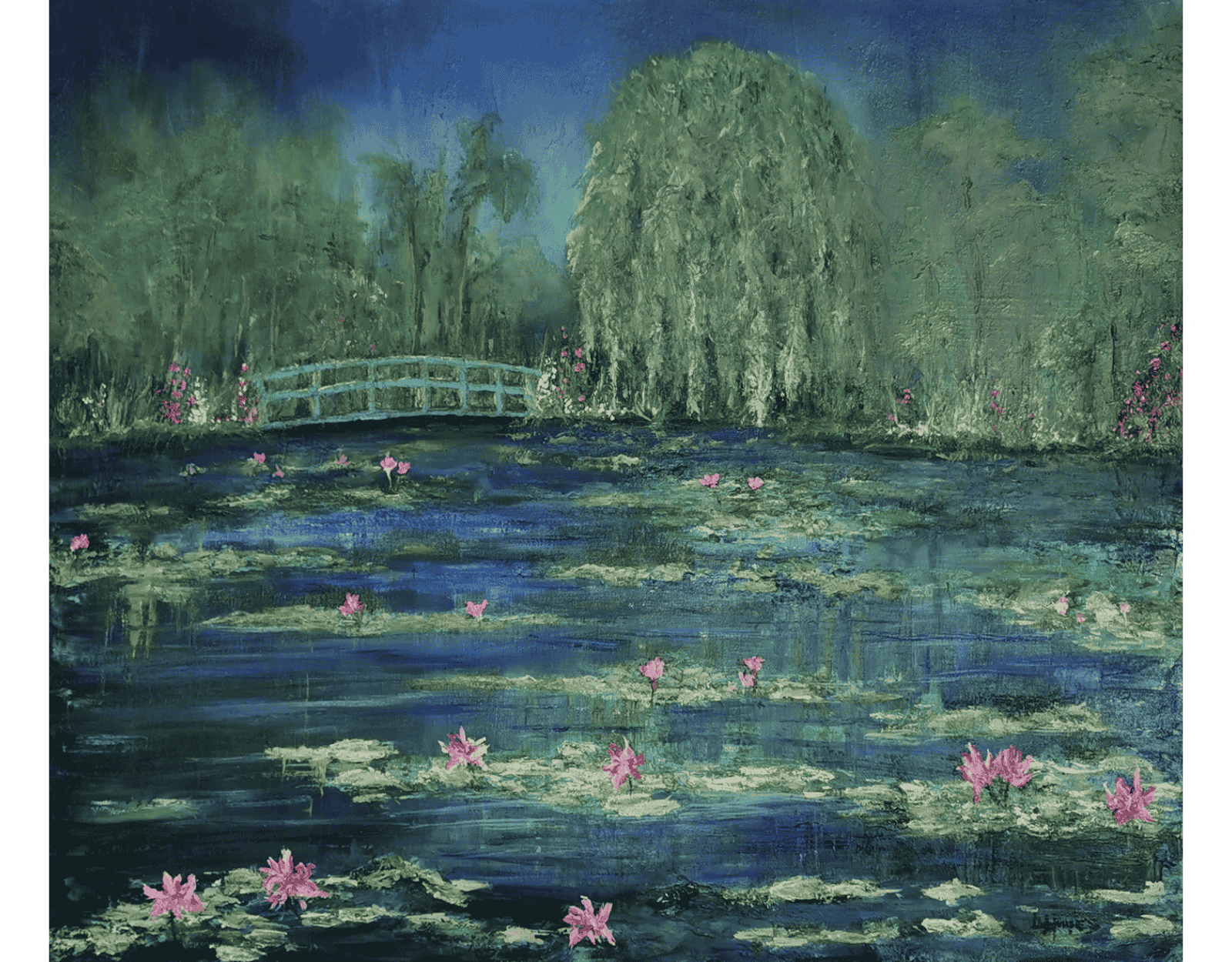 Created with a palette knife and softened using cold wax medium, this piece evokes texture, emotion and atmosphere. The turquoise bridge, pink water lilies, and lush greenery invite viewers into a tranquil dreamscape. The edges of the canvas are painted, making it ready to hang without framing.
