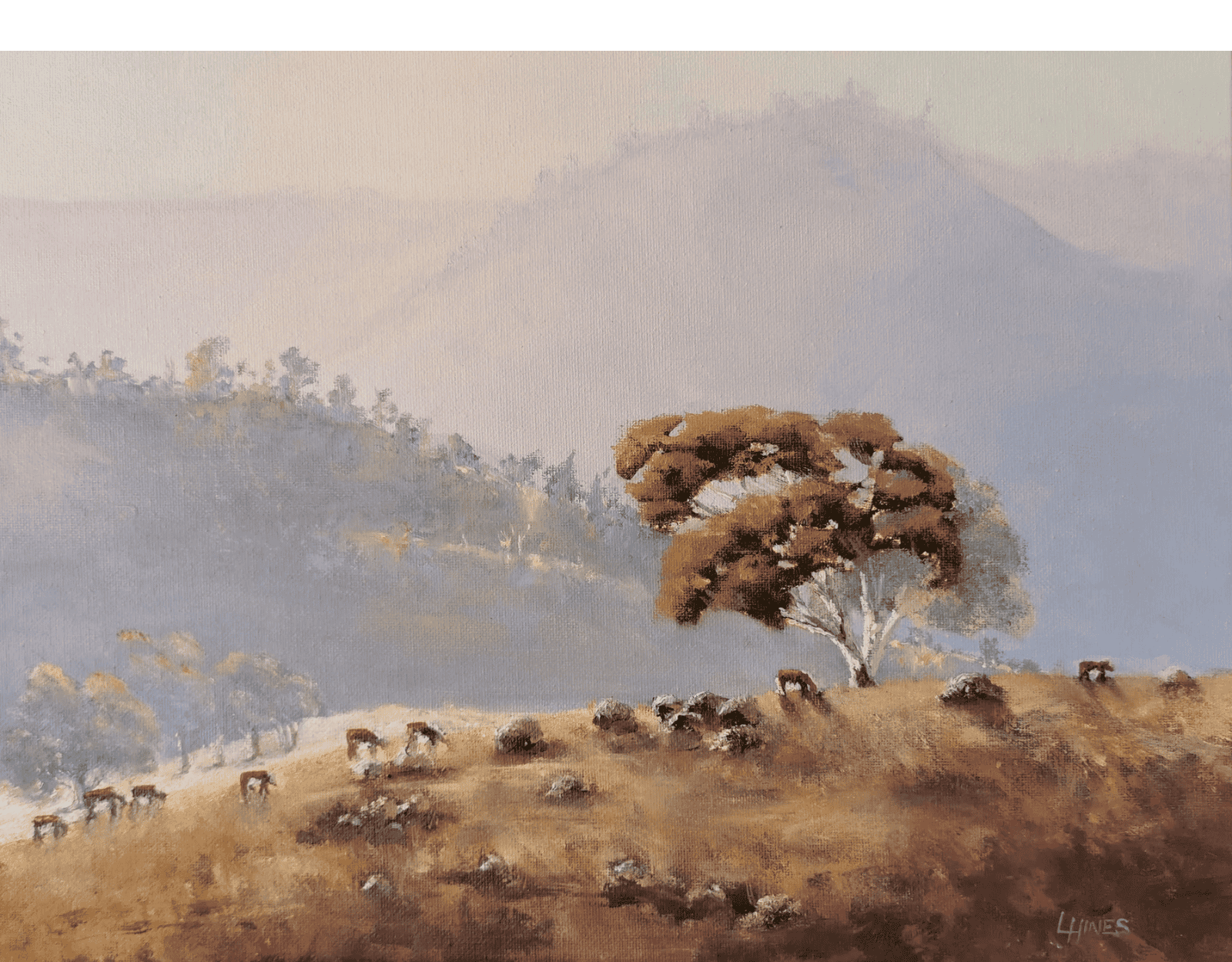 Painted in the atmospheric style of the late Australian artist John Wilson, the composition features soft morning light, grazing animals, and misty hills that fade into the distance. A wide-canopied tree anchors the scene, inviting viewers into a moment of peace and memory.