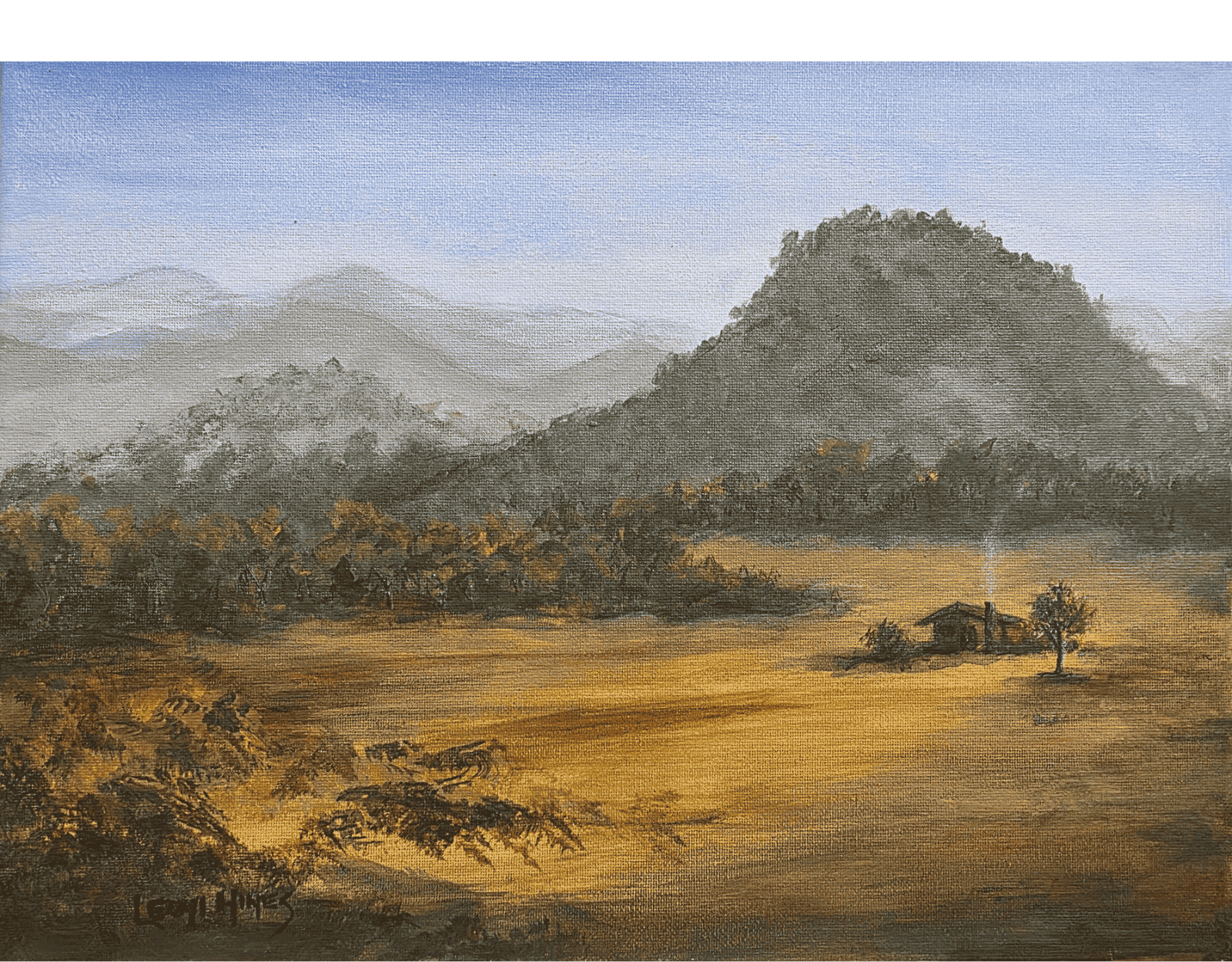 Old Days Gone is an original acrylic painting created en plein air in Barrington, NSW. This tranquil rural scene captures the timeless beauty of the Australian countryside, featuring grassy fields, a rustic hut with a tin roof, and misty hills beyond.