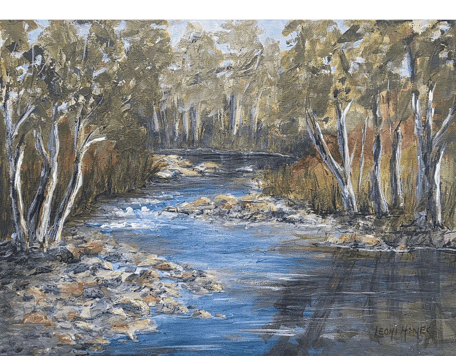 My brushwork brings the forest to life with textured foliage, rocky banks, and the shimmering blues of the river. A celebration of nature’s quiet beauty, perfect for lovers of Australian landscapes and tranquil bush scenes.