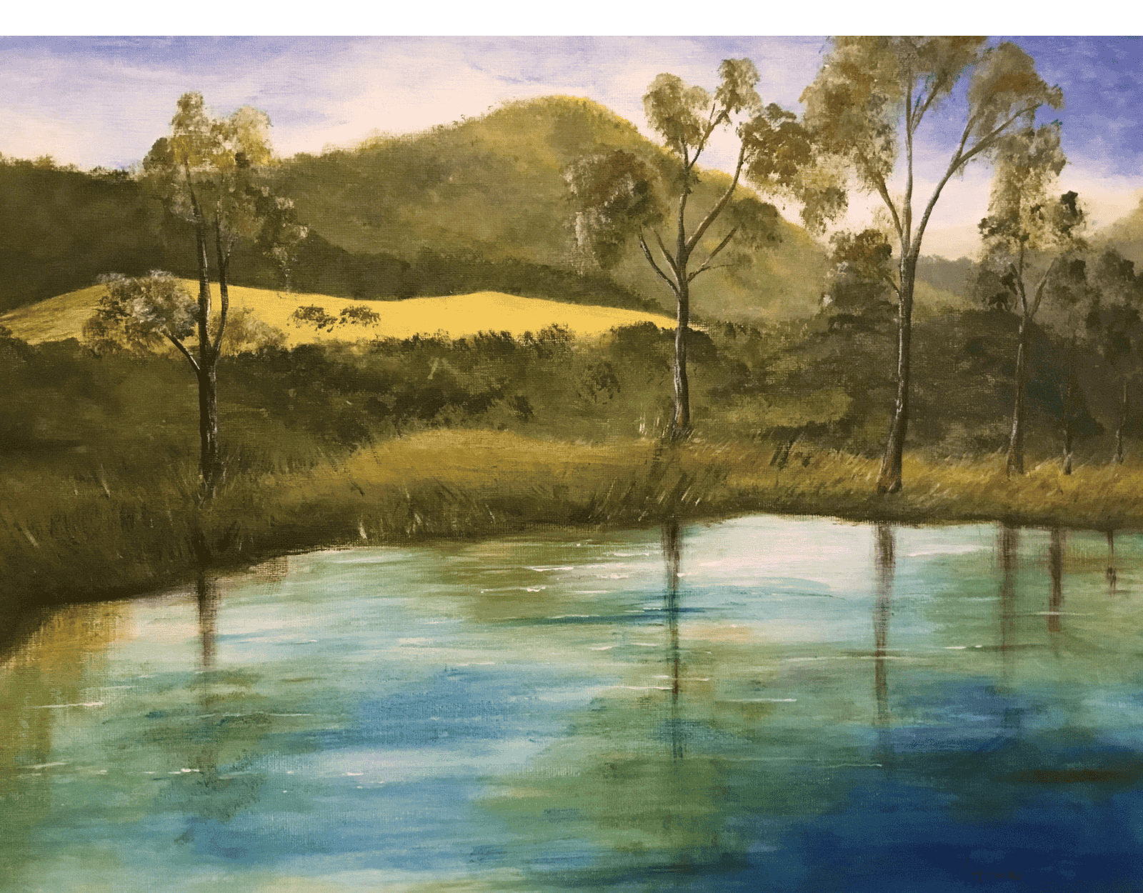 Inspired by quiet mornings spent walking beside a dam on a property in Vacey, NSW, Morning Peace is an original acrylic painting. This tranquil landscape captures the stillness of water, the gentle light of early day, and the soft reflections of trees and hills bathed in golden sunlight.