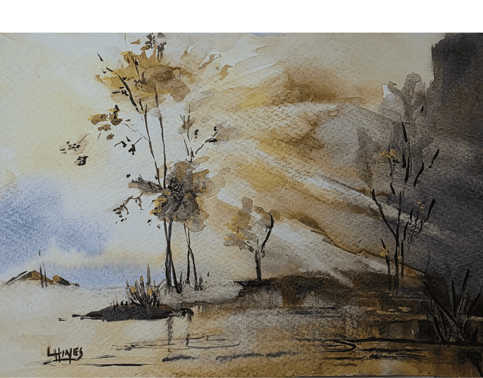 Warm shades of brown, yellow and beige watercolour painting. Light through trees, reflections on water.