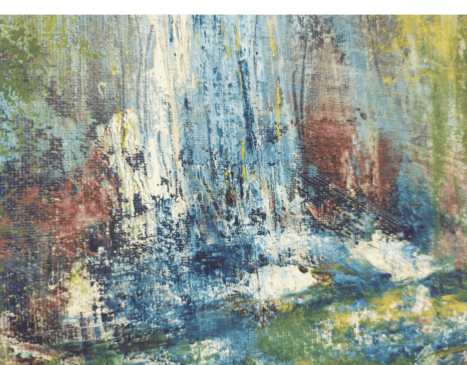 Rich texture, layered colour and expressive mark-making create a lively, abstract–impressionistic surface that draws the viewer into the movement of the water and the delicate blooms rising from it.